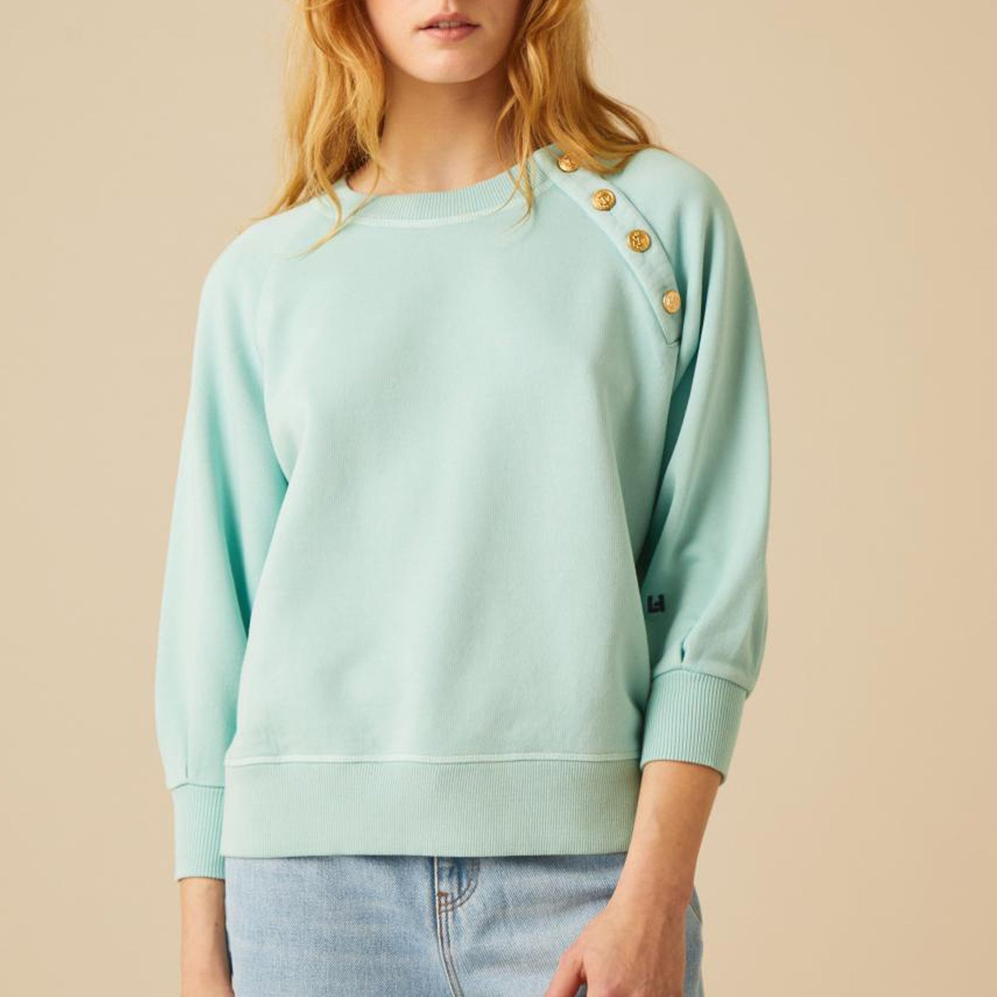 Introducing one of our newest women's labels, Leon & Harper to Mr & Mrs Stitch. Created in Paris in 2010 by Philippe Corbin, Leon & Harper has rapidly insinuated itself into the wardrobes of free-spirited young women through its timeless basics with their unique sense of detail. Leon & Harper creates fashion that is stylish and loose, designed for free movement and subtle seduction. Plain basic sweatshirt with gold buttons in this subtle colours and vintage feel, it's perfect with a pair of denim shorts.