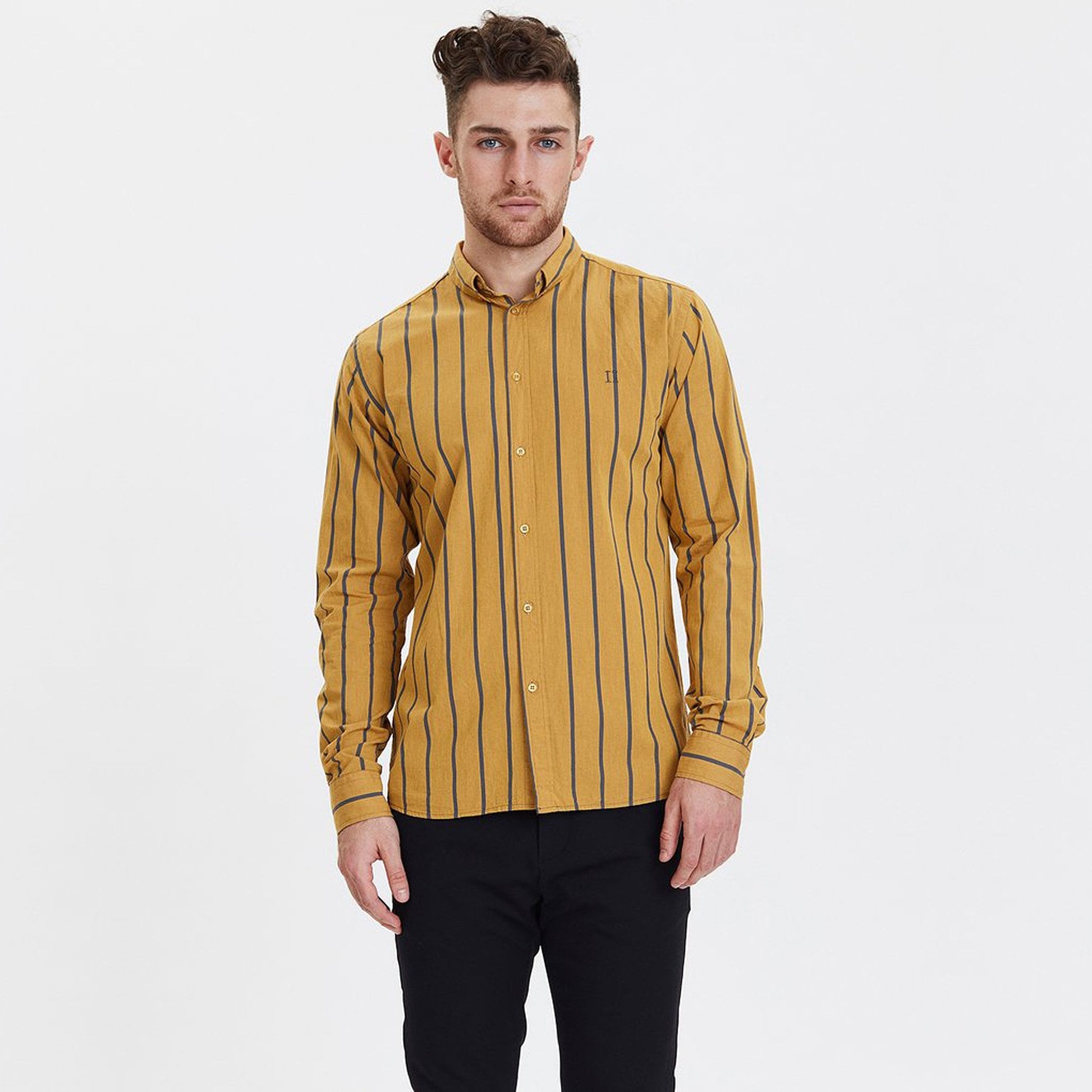 Les Deux is a casual menswear brand, first established in 2009 in Copenhagen. They are known for their distinctive styling, combining preppy and street-style clothing. This casual vertical stripe shirt in yellow by Les Deux has been crafted from a cotton blend giving this shirt a soft touch and a comfortable fit. The features include a button-down collar and buttoned cuffs giving this classic preppy shirt a sophisticated and laid-back feel. The embroidered 'II' logo gives it that typical Les Deux touch. Team this versatile shirt with your favourite pair of jeans or smart chinos.