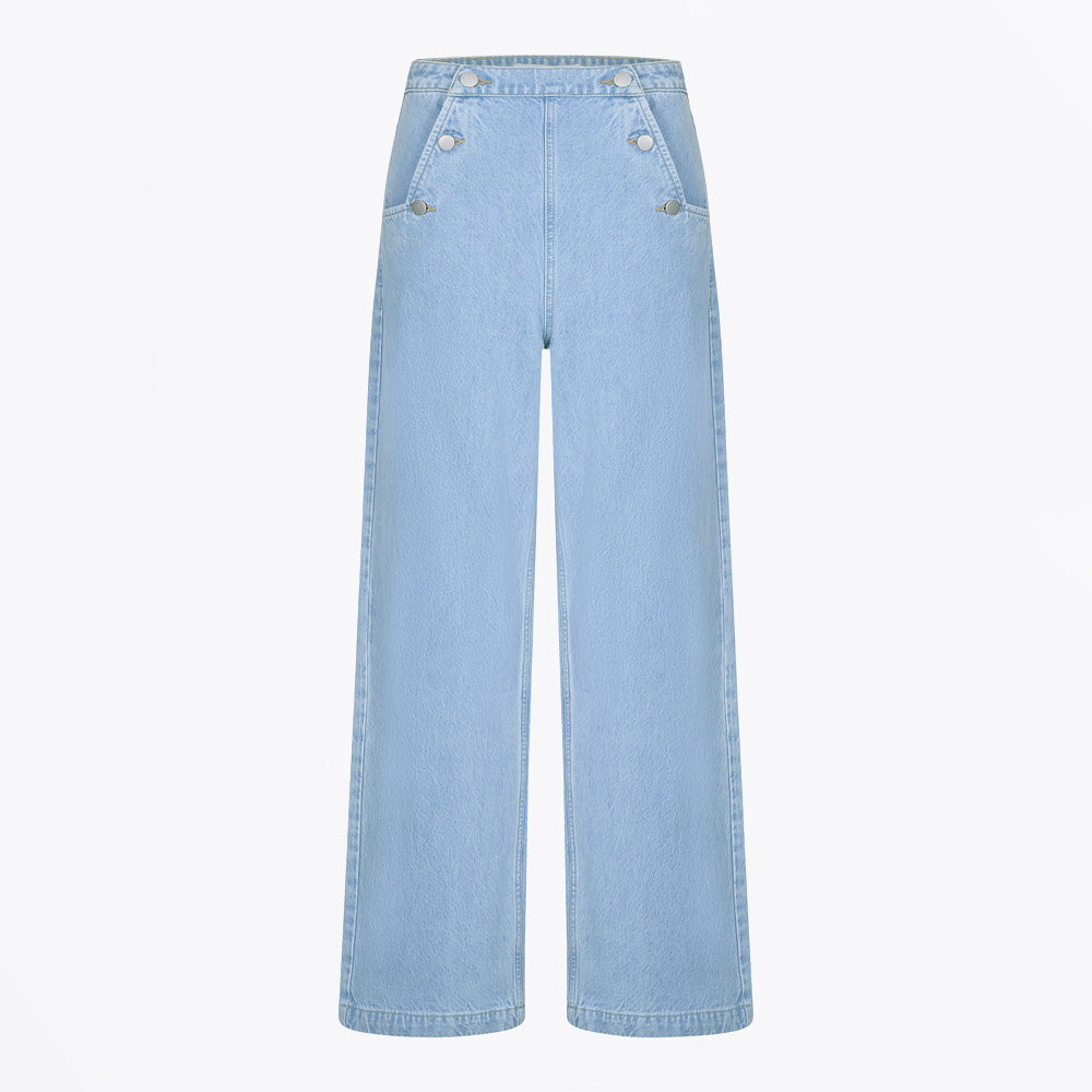 Super high-rise flare with vintage button detailing. Seventy & Mochi statement style meets perfect proportion. Soft kick flare leg creates an effortless silhouette that flatters without overwhelming. High-rise cut sits at the natural waist for a timeless, elongating fit. Crafted from stretch denim in a midweight fabric that moves with you while maintaining its shape throughout the day. The sunbleached finish adds vintage character, while thoughtful button detailing elevates the everyday essential into a standout piece. Perfect for styling with everything from fitted tops to oversized shirts.