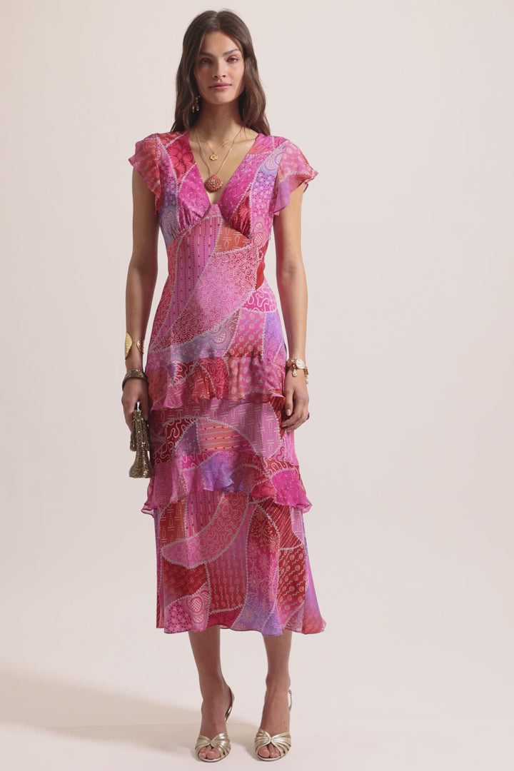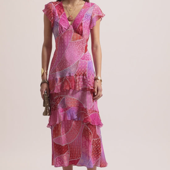 The Meena dress reimagines RIXO's most-loved design elements into an entirely fresh silhouette. Crafted from lightweight silk crepe de chine, this midi dress features signature bias-cut tailoring that skims the body with effortless elegance. Floaty crinkled-georgette ruffles and an adjustable waist tie add movement and definition, while the empire waist with its distinctive underbust seam creates a flattering, sculpted fit. A classic V-neck discreetly accommodates a bra, short sleeves offer versatility, and a concealed side zip ensures a seamless finish. True to size, this piece delivers the refined drape and wearability RIXO is renowned for.