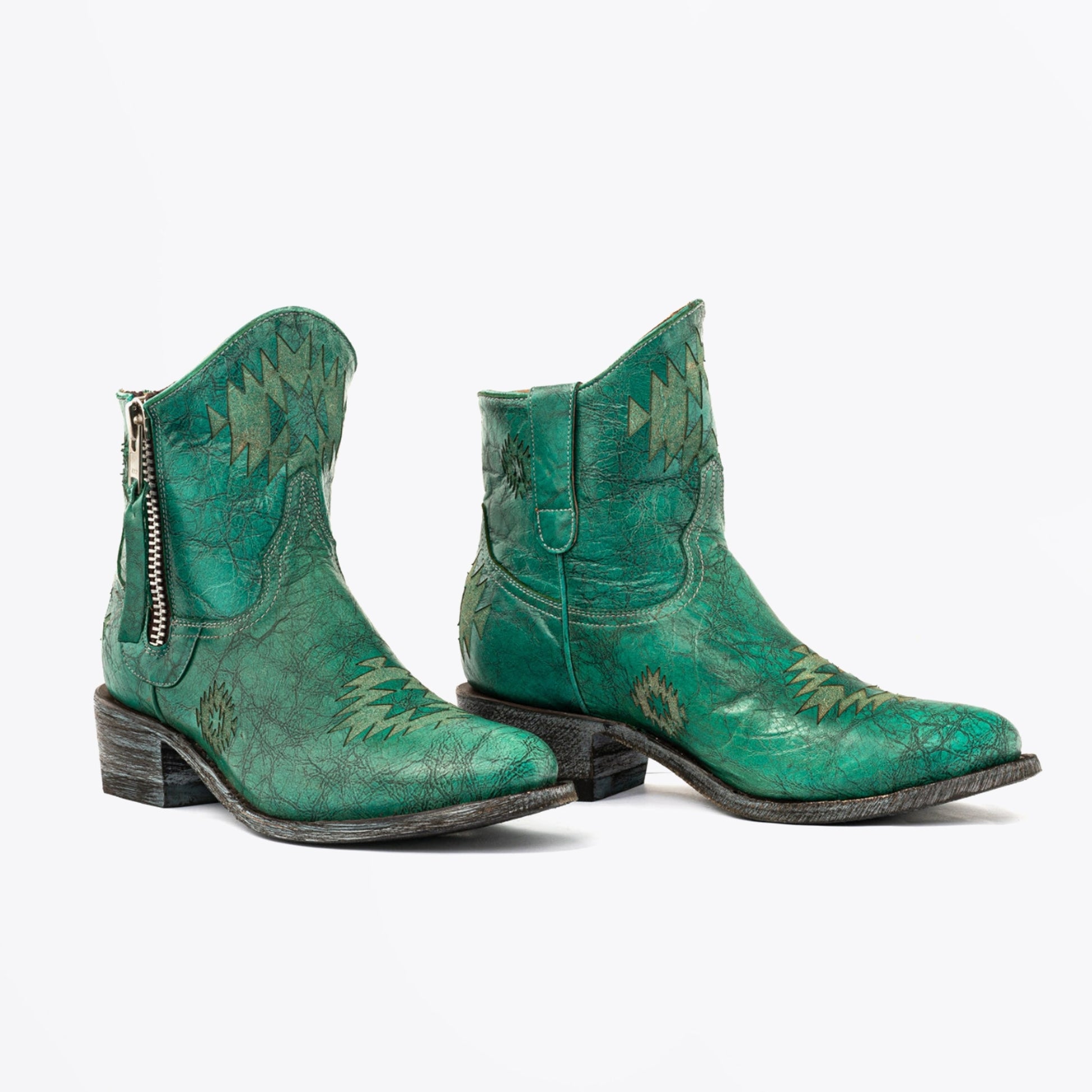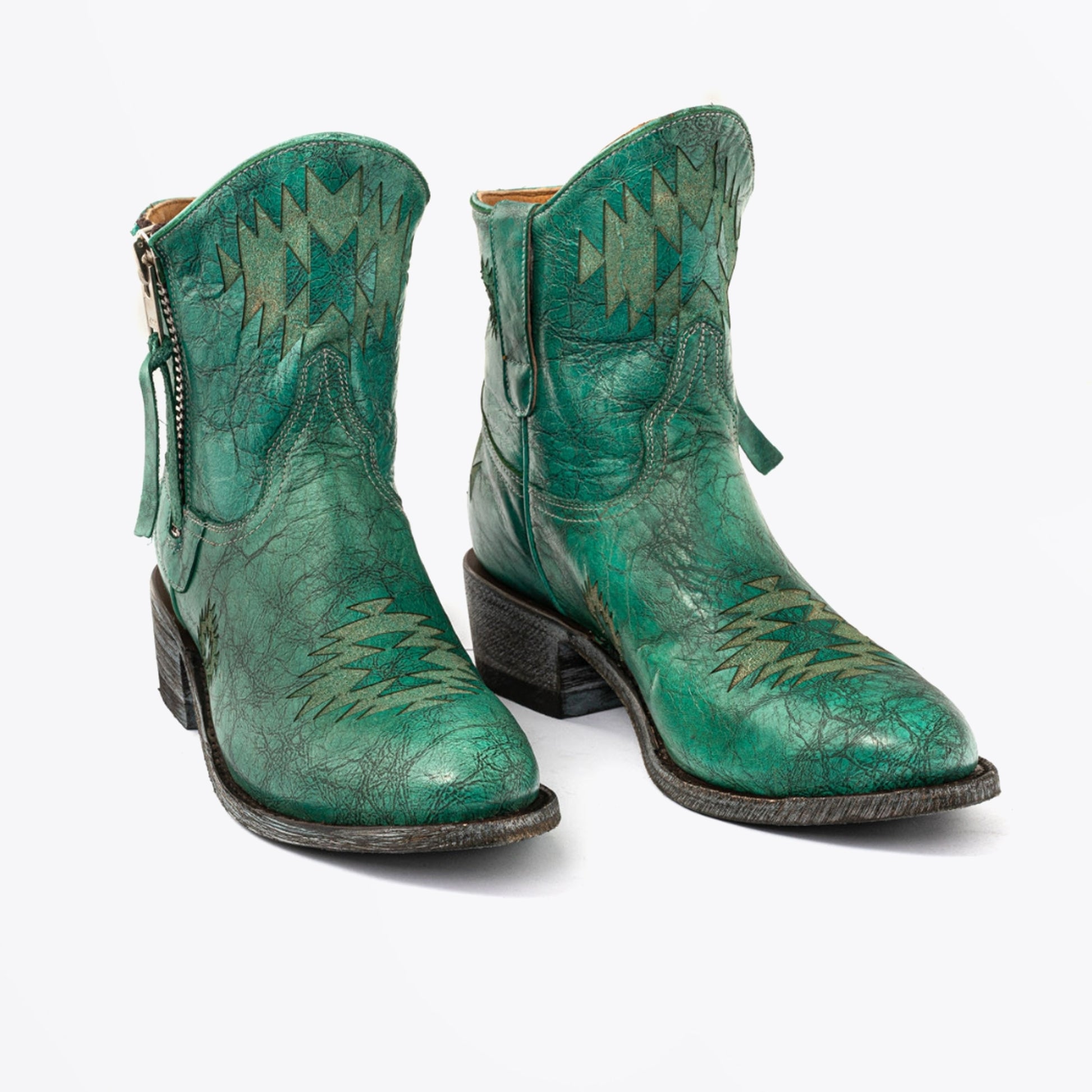 New to Mr and Mrs Stitch, we fell in love with Mexicana and their mastery of merging a link between Europe and Mexico. The brand, born in 1988, continues to create accessories with authentic character. These hand-made and home made boots are the perfect mix between classic, basic and elaborate. The interesting colours and contrasting textures to create pure art for your feet. These Toluca turquoise leather ankle boots feature a round toe with an embossed Navajo style, leather sole and heel with stitching and a side zip. Channel your inner Yellowstone in these dreamy ankle boots. Wear with dresses, jeans or cool girl shorts.