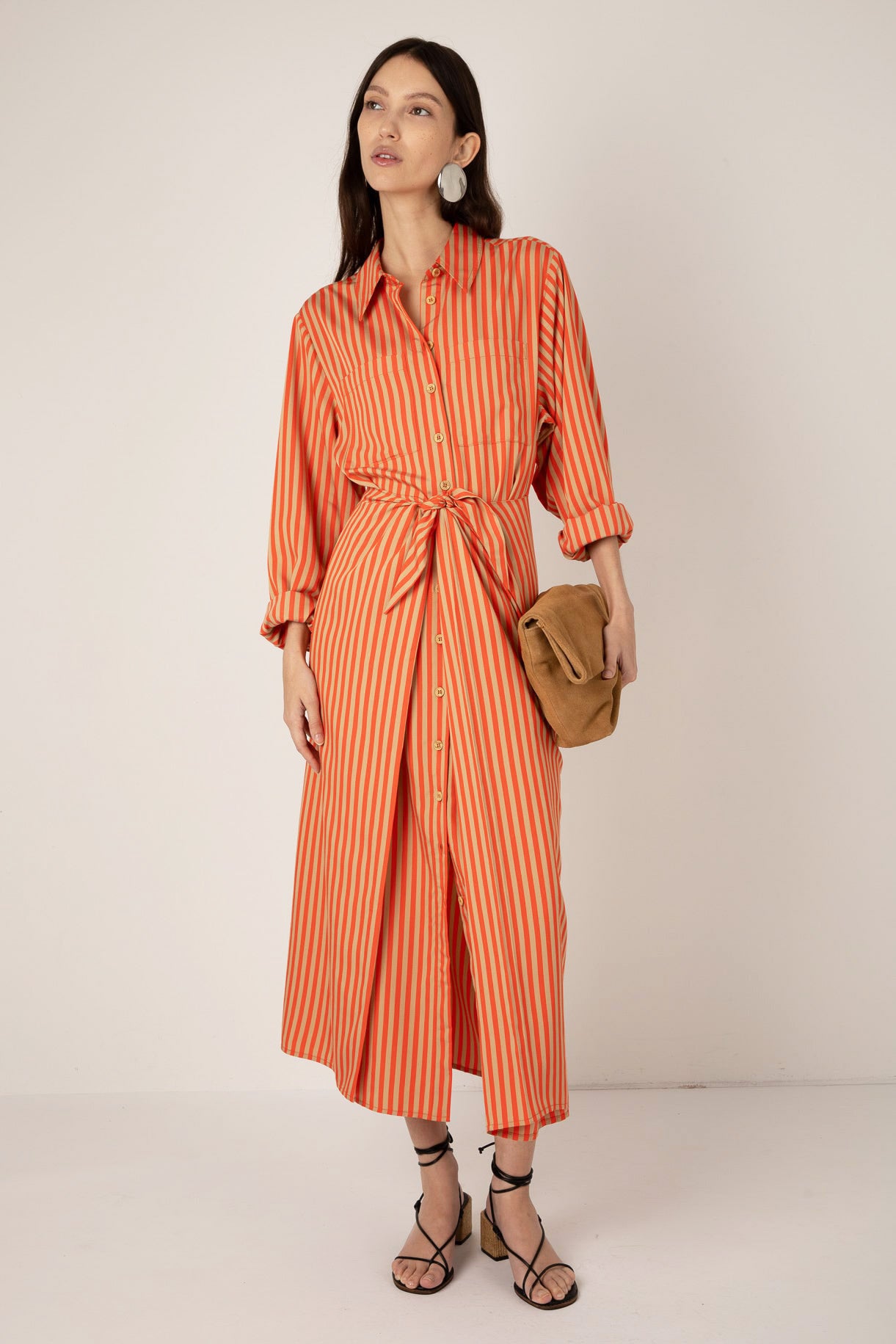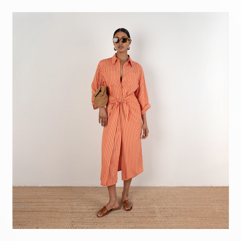 The Lina Tie Front Shirt Dress combines effortless style with flattering structure. Cut to a versatile mid-length, this piece features a classic button-down front and cuffed sleeves that allow comfortable movement throughout your day. The self-tie waist knot creates definition and shape, delivering a refined silhouette that works from office to weekend. In warm orange sand, it's a wardrobe essential that transitions seamlessly across seasons.