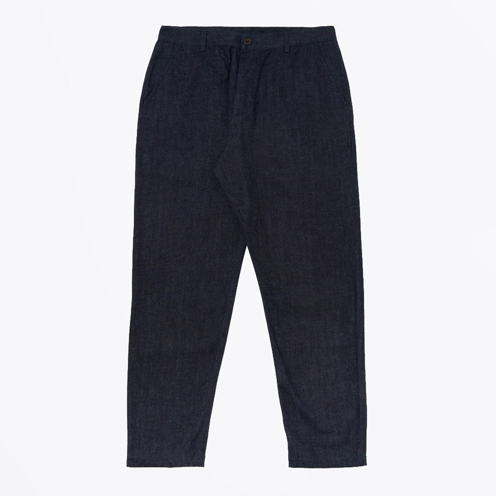The Military Chino represents our refined interpretation of timeless workwear tailoring. Cut from 100% organic cotton in a brushed denim finish, this trouser delivers a flattering silhouette that balances comfort with contemporary style. The mid-rise sits cleanly through the hips and thigh before tapering elegantly to the ankle, creating a streamlined profile without restriction. Practical details include a button fly, two front pockets, and two rear jetted buttoned pockets. Care for longevity: wash at 30 degrees, avoid bleach and tumble drying, warm iron only, and do not dry clean.