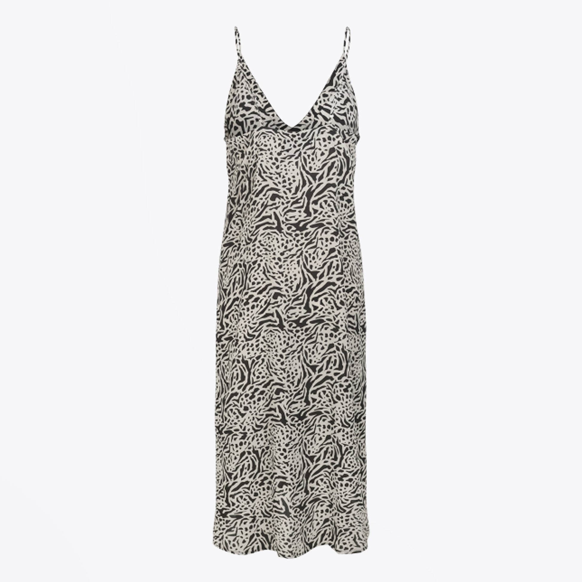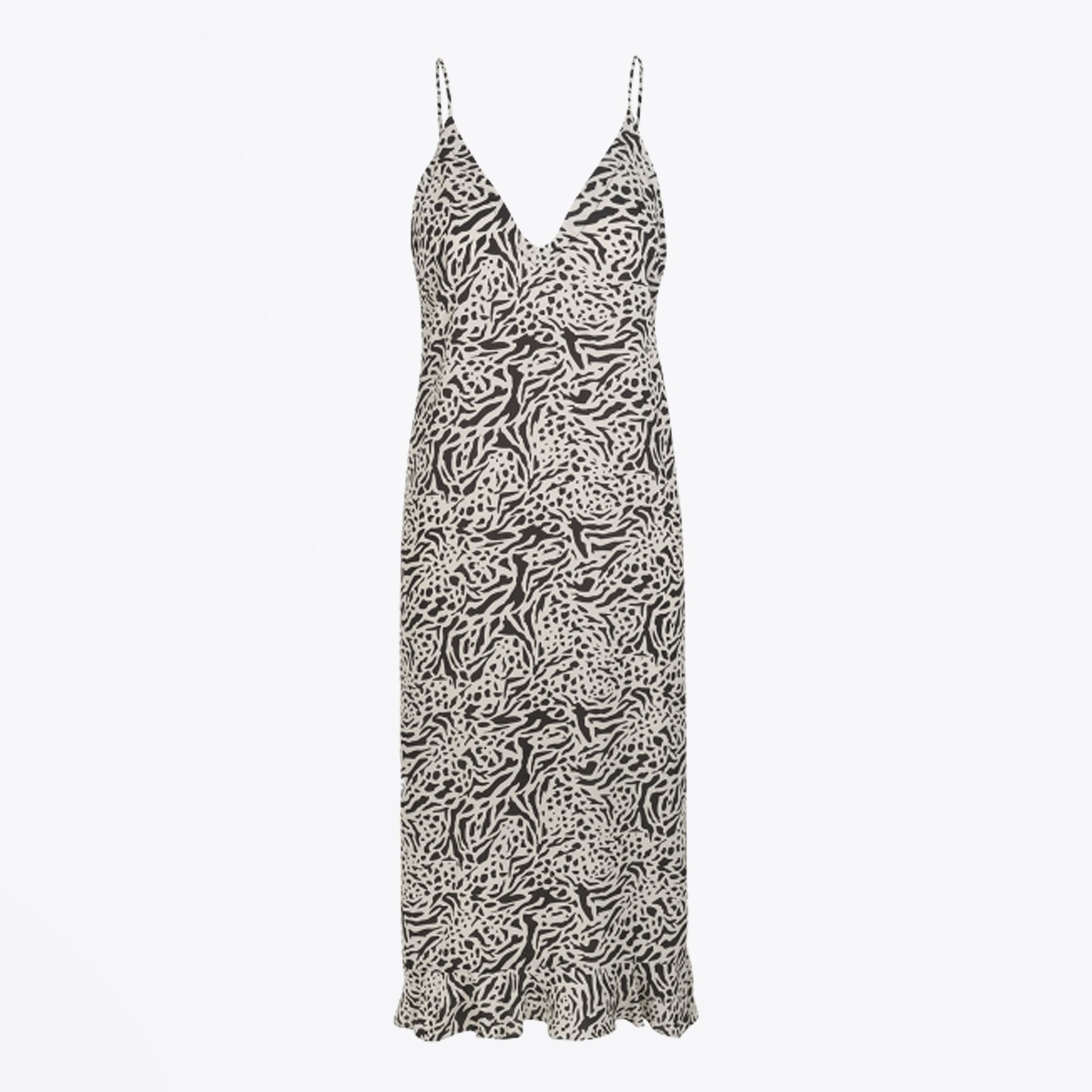 Munthe is a Copenhagen-based label known for its signature style that represents the carefree attitude of the cool and casual Scandinavian girl. Munthe's design is best know for its hand-painted prints and feminine silhouettes. Animal print midi dress crafted in a lightweight, soft fabric with animal print.This feminine style has been designed with dress has thin straps and ruffled hem and is wearable over a T-shirt or under a knit on colder days. A beautiful piece that could be worn with ankle boots or sneakers for a cool look!