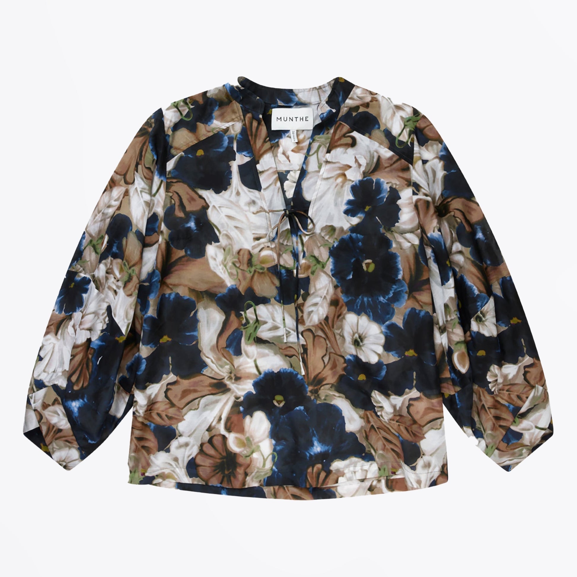 Munthe is a Copenhagen-based label known for its signature style that represents the carefree attitude of the cool and casual Scandinavian girl. Munthe's designs are best known for their hand-painted prints and feminine silhouettes. Add fun to your designer tops with this option from Munthe. This Elevate top features a regular fit, beautiful floral print, long sleeves, deep V cut neckline, tie closure, crafted in a Silk and Cotton blend. Wear these tops with your favourite designer jeans and designer heels.