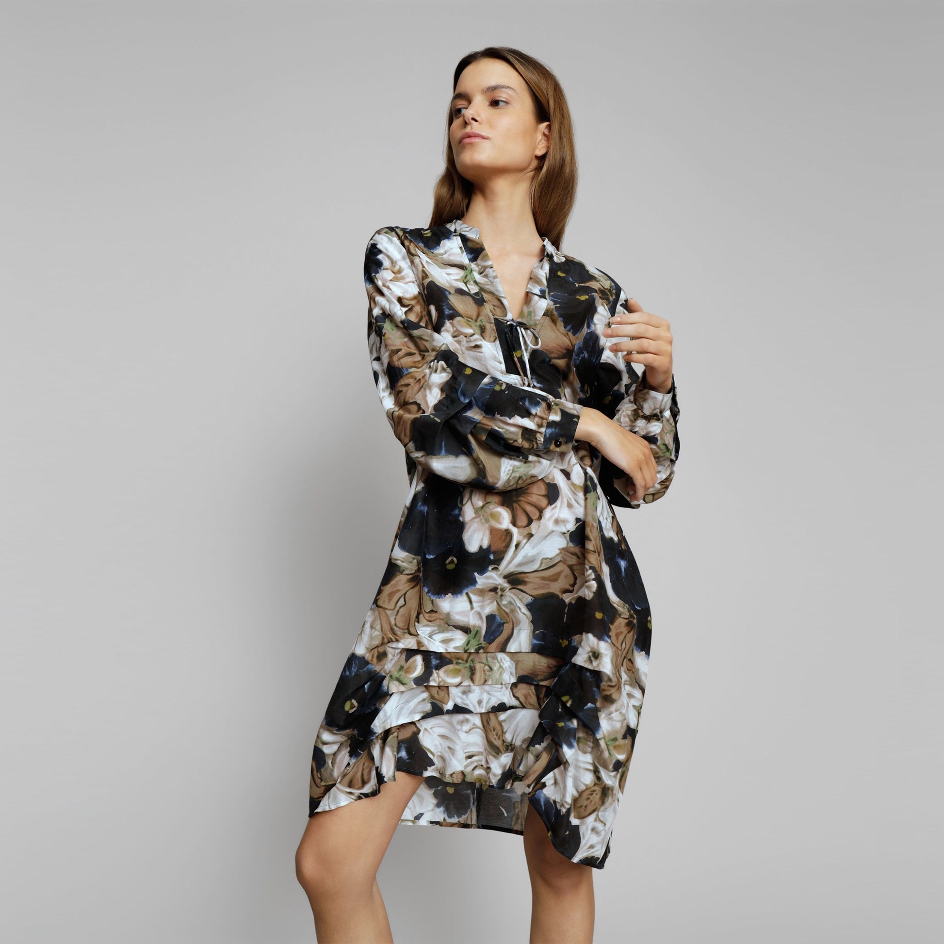 Munthe is a Copenhagen-based label known for its signature style that represents the carefree attitude of the cool and casual Scandinavian girl. Munthe's designs are best known for their hand-painted prints and feminine silhouettes. Add fun to your designer dress with this option from Munthe. This Eleven dress features a beautiful floral print, regular fit, long sleeves and crafted in a Silk and Cotton blend. Wear this dress with your favourite designer jeans and designer heels.