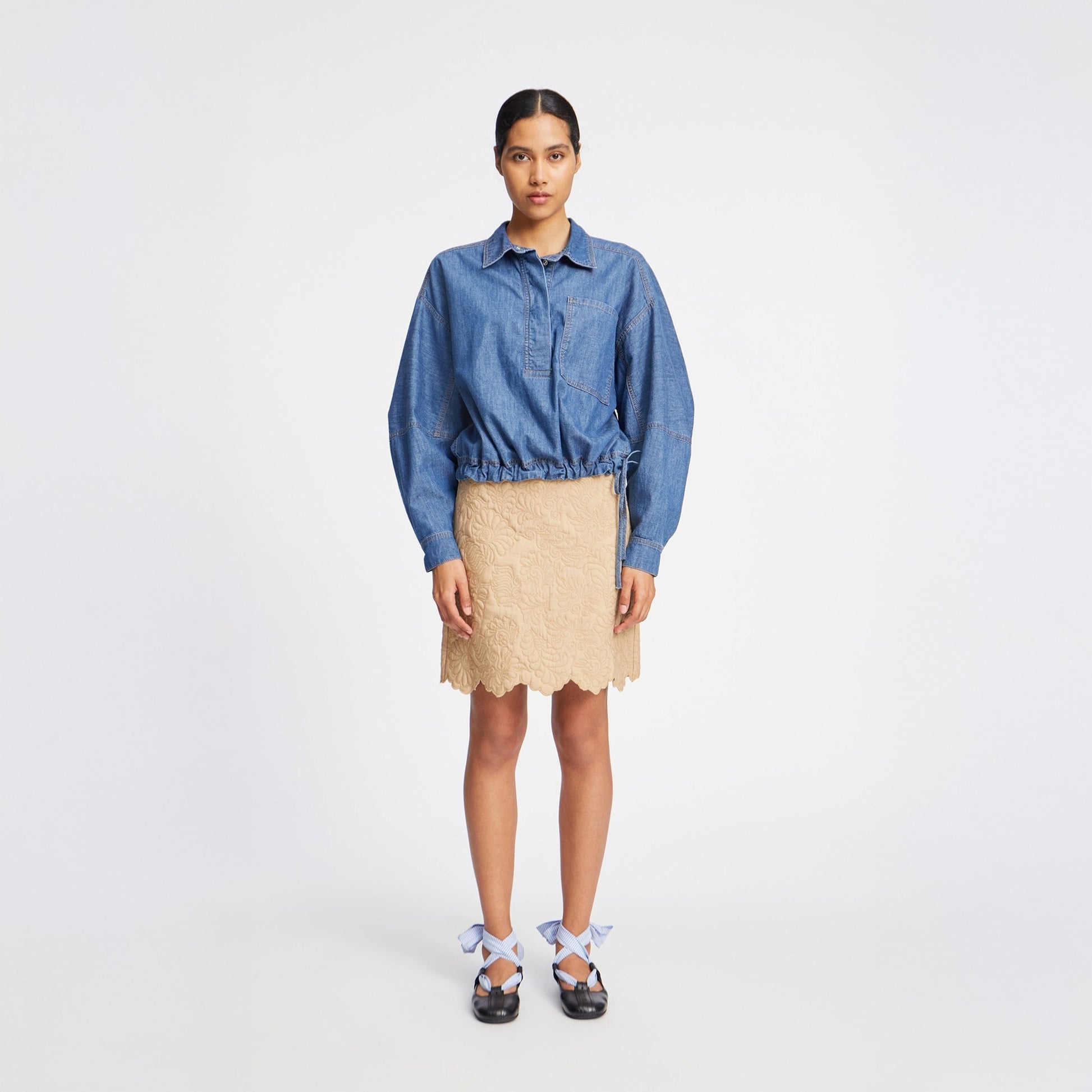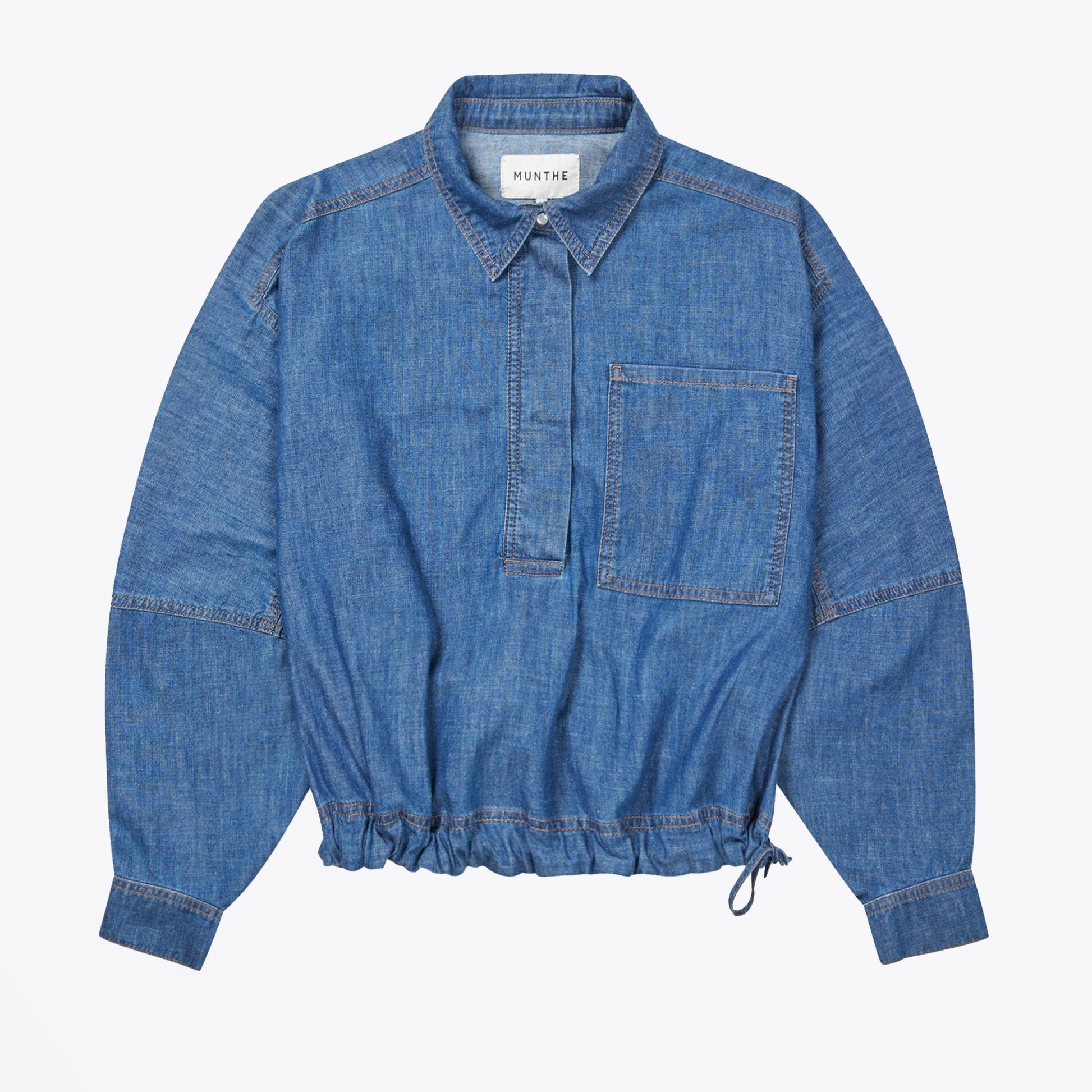 Munthe is a Copenhagen-based label known for its signature style that represents the carefree attitude of the cool and casual Scandinavian girl. Munthe's designs are best known for their hand-painted prints and feminine silhouettes. Add fun to your designer wardrobe with this option from Munthe. This Fihr denim blouse features half down opening and an elegant tie detail at bottom, long sleeves with short cuffs.. Wear this top with Paige denim.