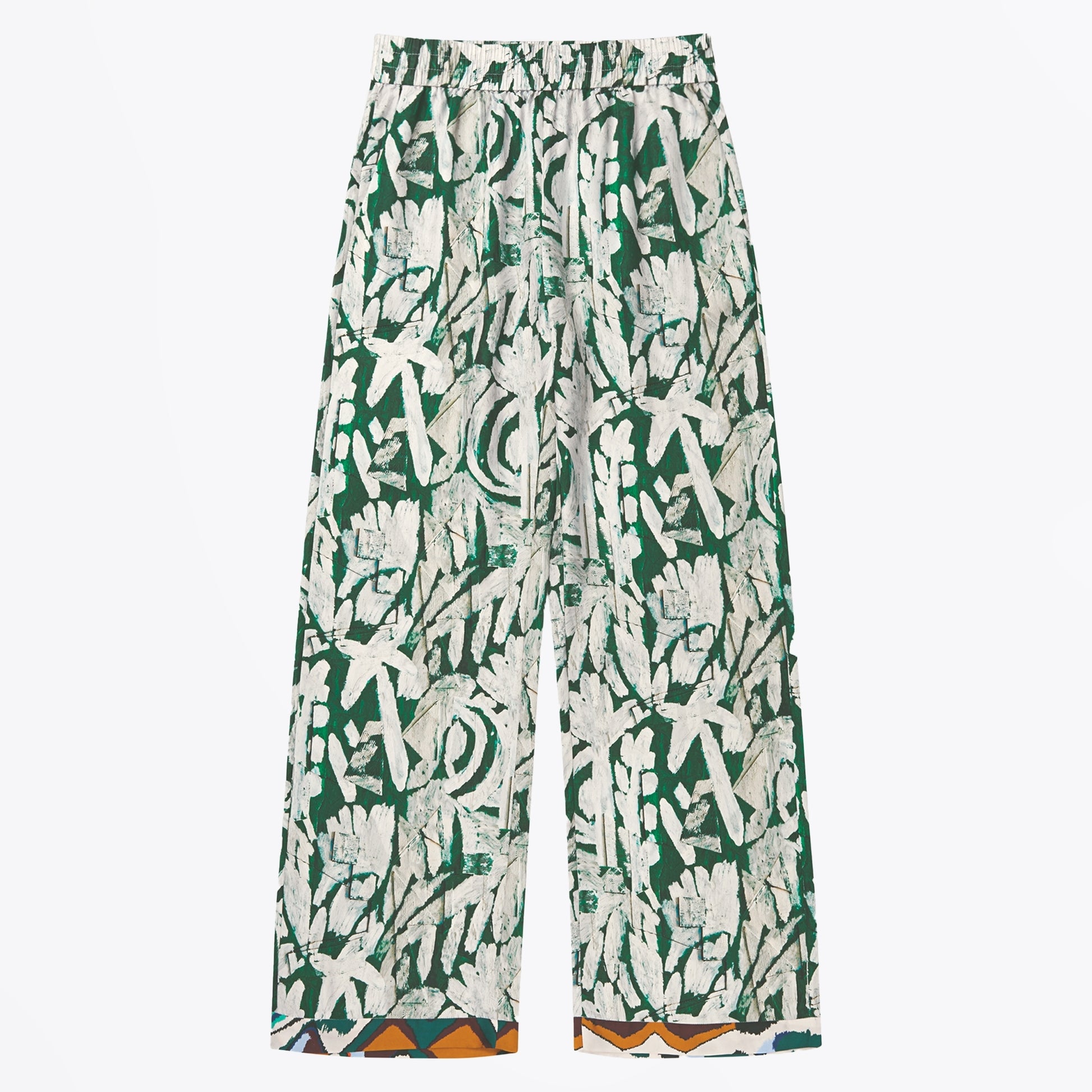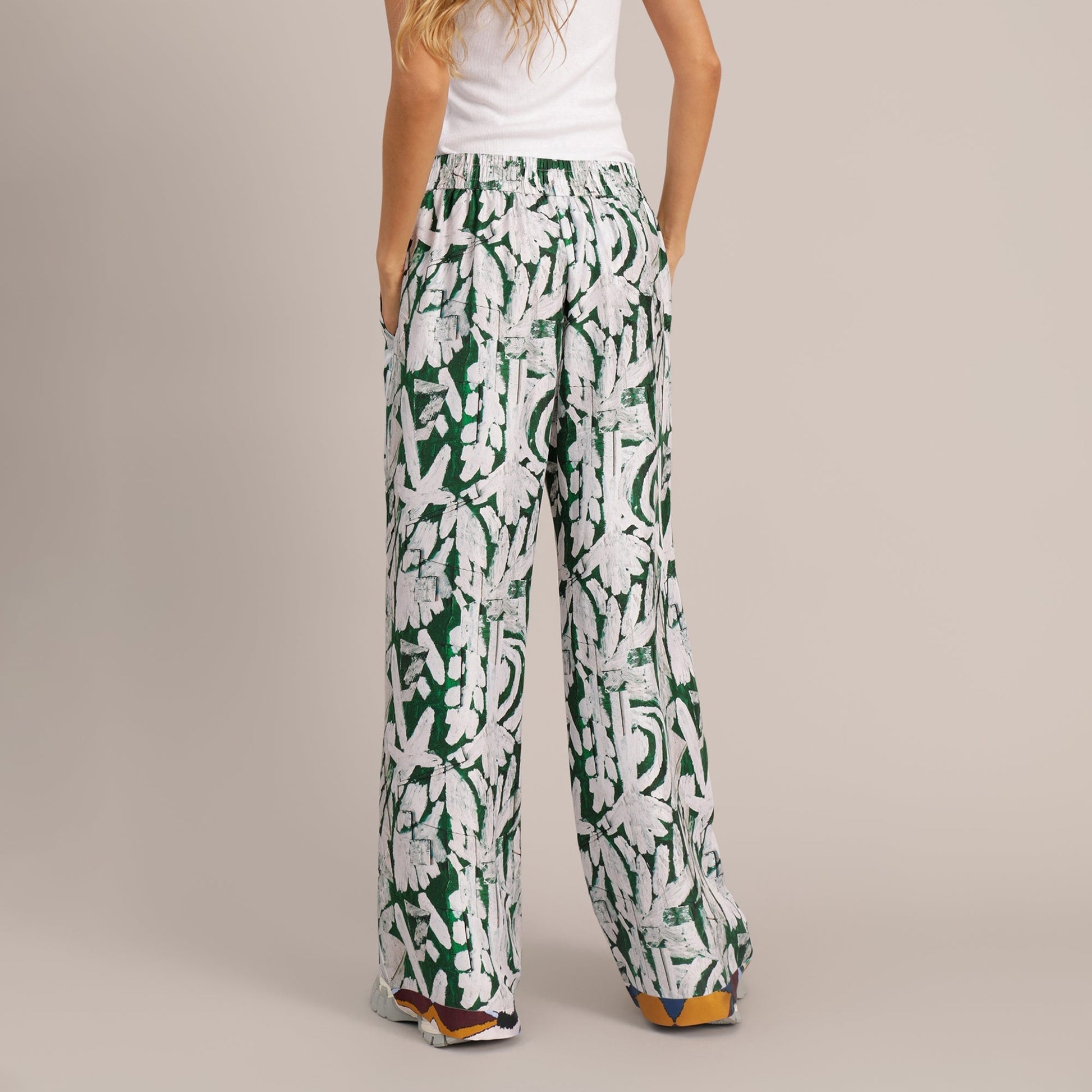 Munthe is a Copenhagen-based label known for its signature style that represents the carefree attitude of the cool and casual Scandinavian girl. Munthe's designs are best known for their hand-painted prints and feminine silhouettes. Add a fun, chunky print to your trousers this season with this option from Munthe. Crafted from 100% silk, these trousers feature a chunky paint style print with botanical motifs, on a deep green base. These trousers have an elasticated waistline, and a contrasting fabric on the hem. Wear these trousers with a pair of Vejas and a plain tee for a cool weekend look.