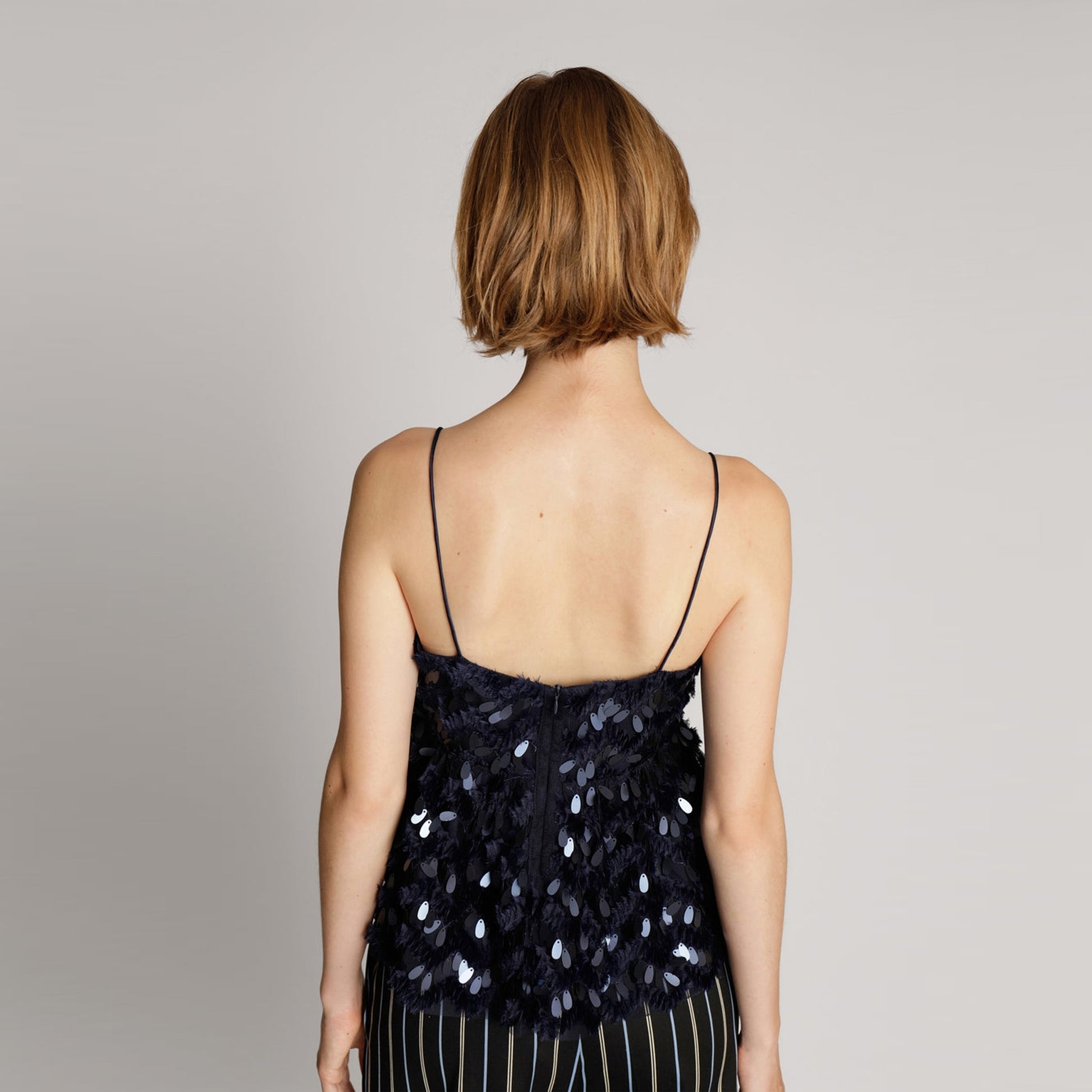 Munthe is a Copenhagen-based label known for its signature style that represents the carefree attitude of the cool and casual Scandinavian girl. Munthe's designs are best known for their hand-painted prints and feminine silhouettes. Add fun to your designer wardrobe with this option from Munthe. This Luxembourg top feature beautifully elegant sequins and elegant strops, a discrete zip closure and crafted in a bold navy. Wear this top with the Monsoon trousers and a pair of Paul Smith sneakers.