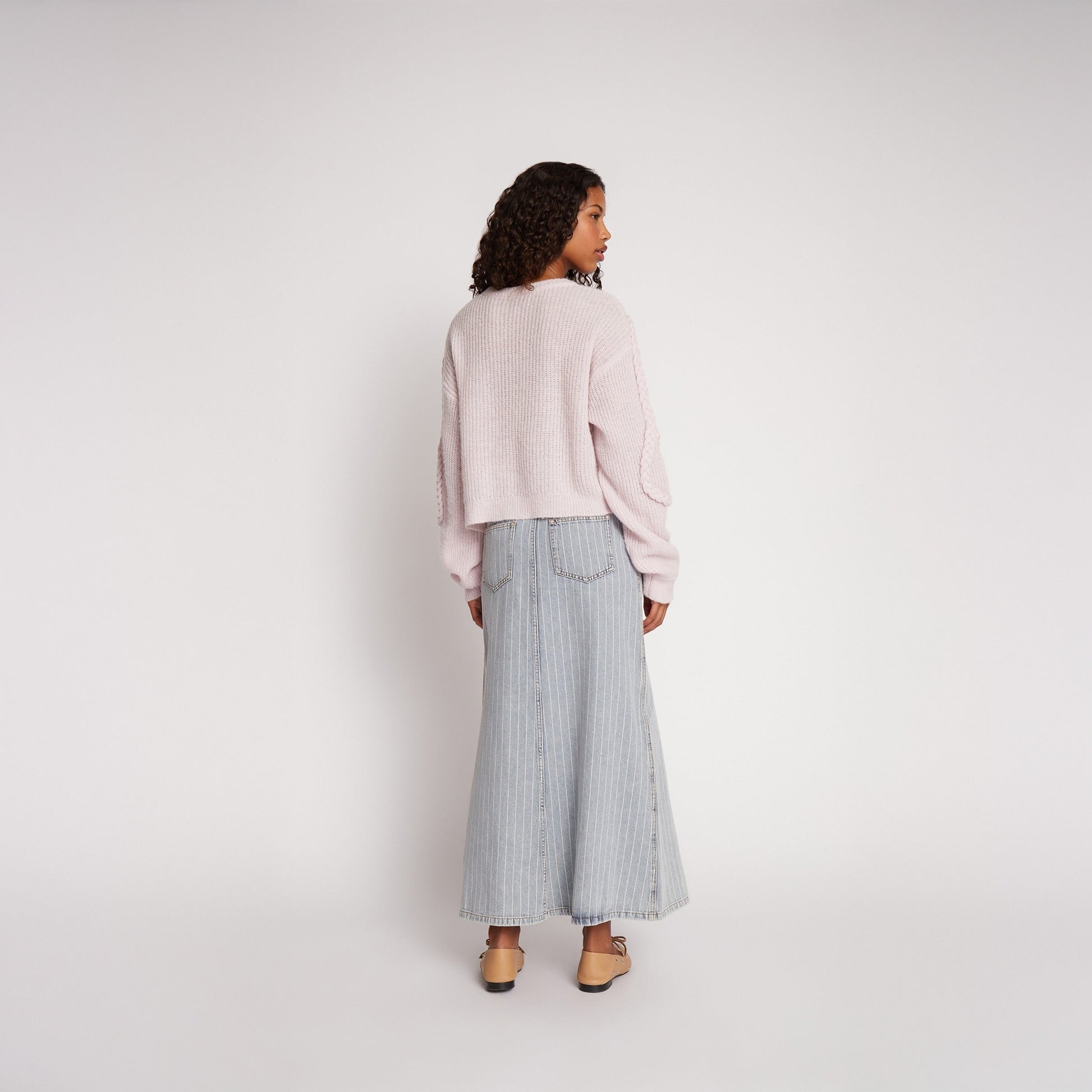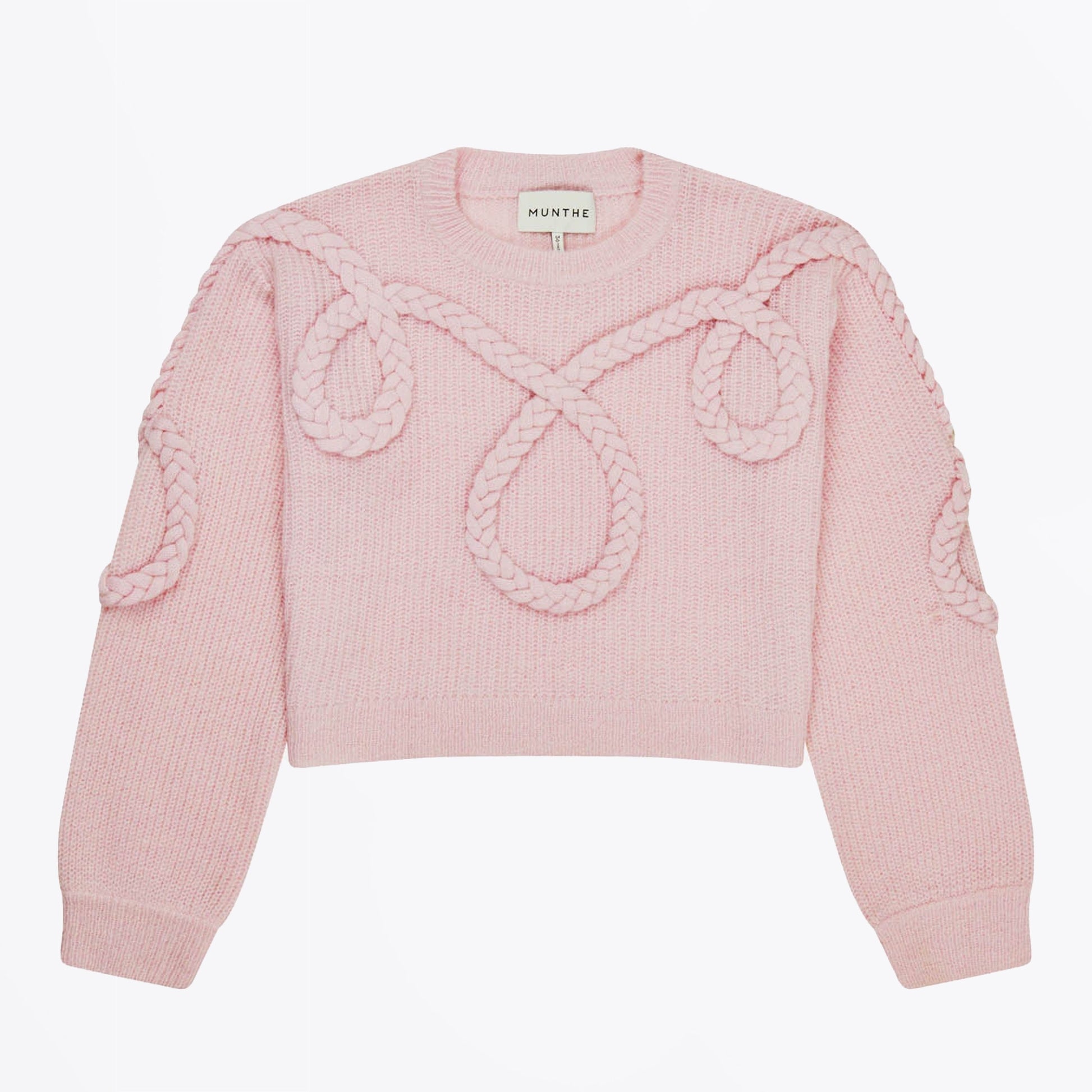 Munthe is a Copenhagen-based label known for its signature style that represents the carefree attitude of the cool and casual Scandinavian girl. Munthe's designs are best known for their hand-painted prints and feminine silhouettes. Add fun to your designer Knitwear with this option from Munthe. This Sakira knit top features a rose pink western rope design with a cropped fit, round neckline and long sleeves. Wear this with some Paige jeans and Hoff sneakers.