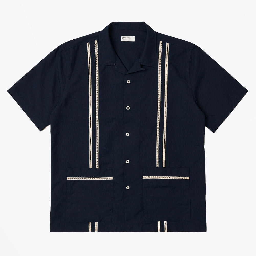 This Classic Universal Works Oxford Tropicana Shirt in navy cotton delivers timeless style for warm-weather dressing. The open collar design and refined detailing offer versatility across casual and smart-casual occasions. Crafted from breathable cotton, this spring and summer essential pairs effortlessly with pants, chinos, cropped trousers, or shorts. A wardrobe staple that transcends seasonal trends.