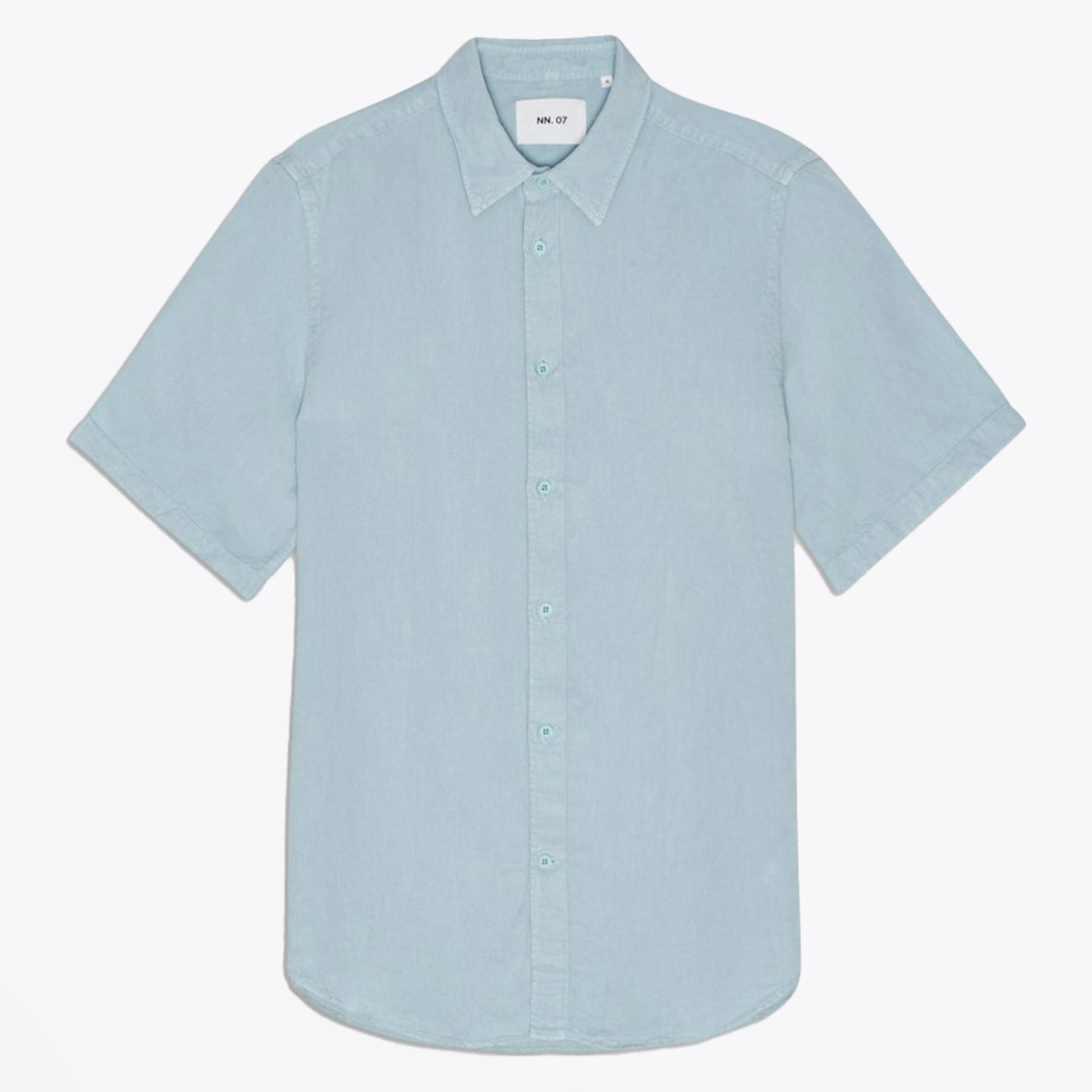 Founded by two friends in 2007, NN07 strives to change the modern to casual wardrobe. Based in Copenhagen however the brand strives to not to focus on nationalities rather personalities when it comes to their unique garments. Inspired by dedicated people and communities, the brand creates products with attention to the demands of today. This light blue Arne shirt features short sleeves button up fastening, collared neckline and curved hem. Wear this shirt with a pair of universal works trousers and some Hoff sneakers.