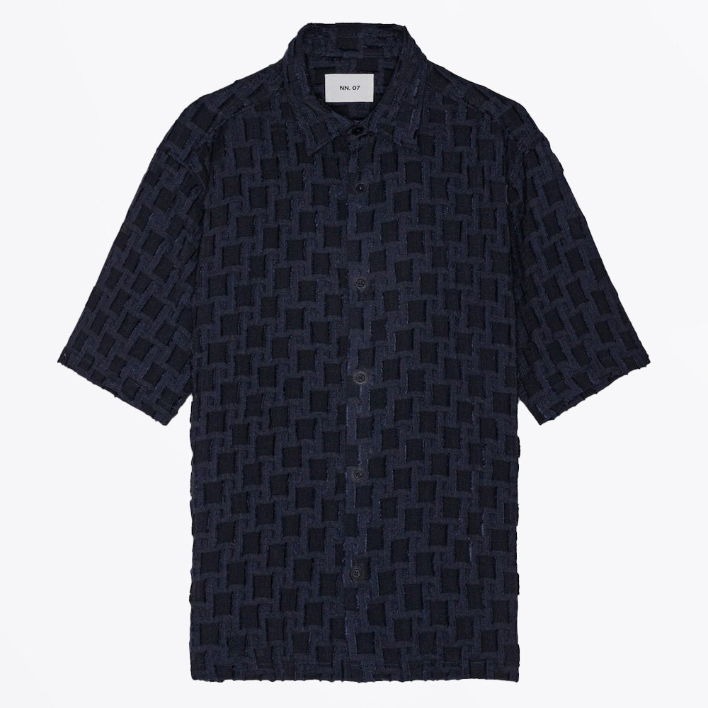 Founded by two friends in 2007, NN07 strives to change the modern to casual wardrobe. Based in Copenhagen however the brand strives to not to focus on nationalities rather personalities when it comes to their unique garments. Inspired by dedicated people and communities, the brand creates products with attention to the demands of today. This shirt is crafted with fil coupe cotton and features a fil coupe jacquard design, collared neckline, patch pocket with a relaxed fit. Wear this shirt with a pair of designer shorts and designer trainers.