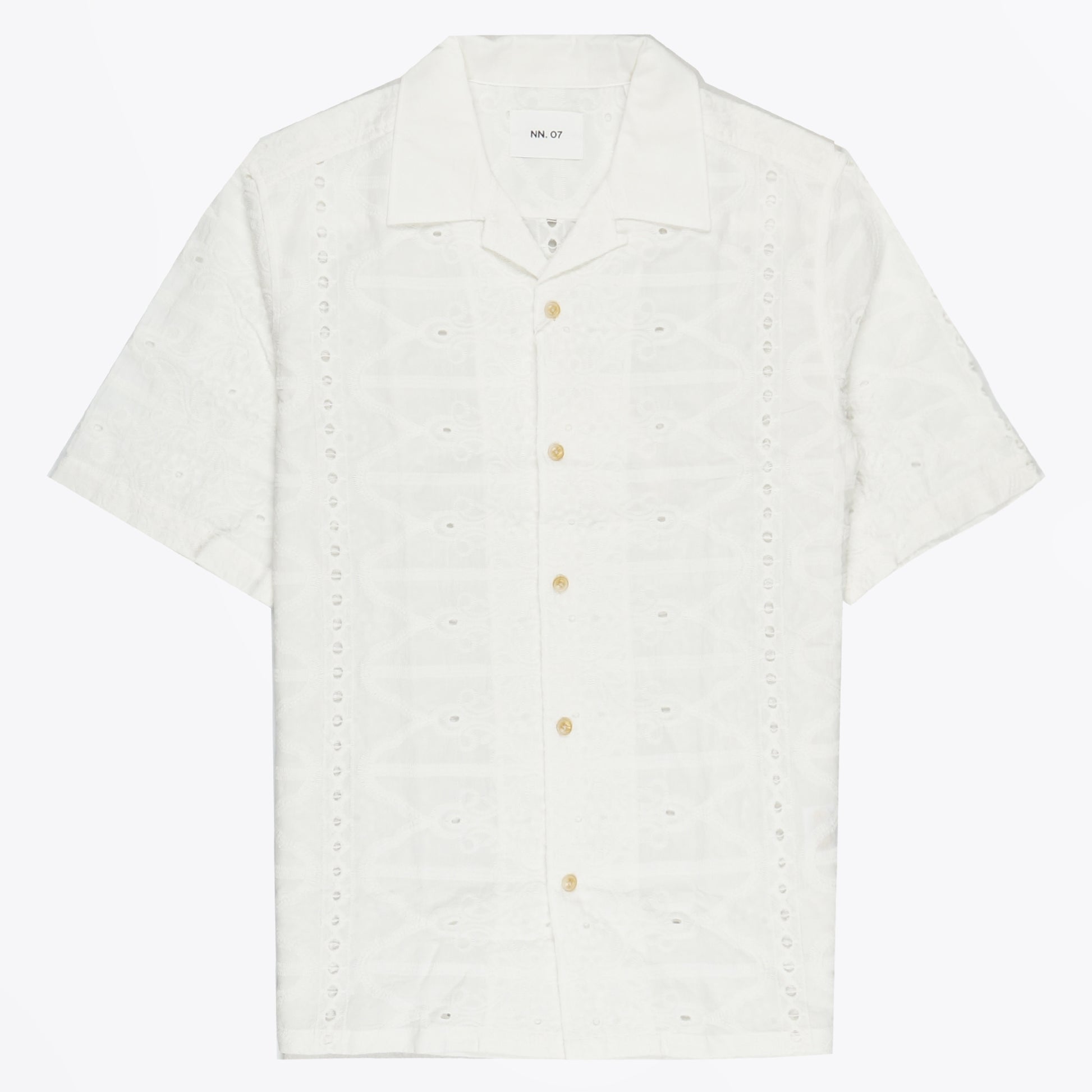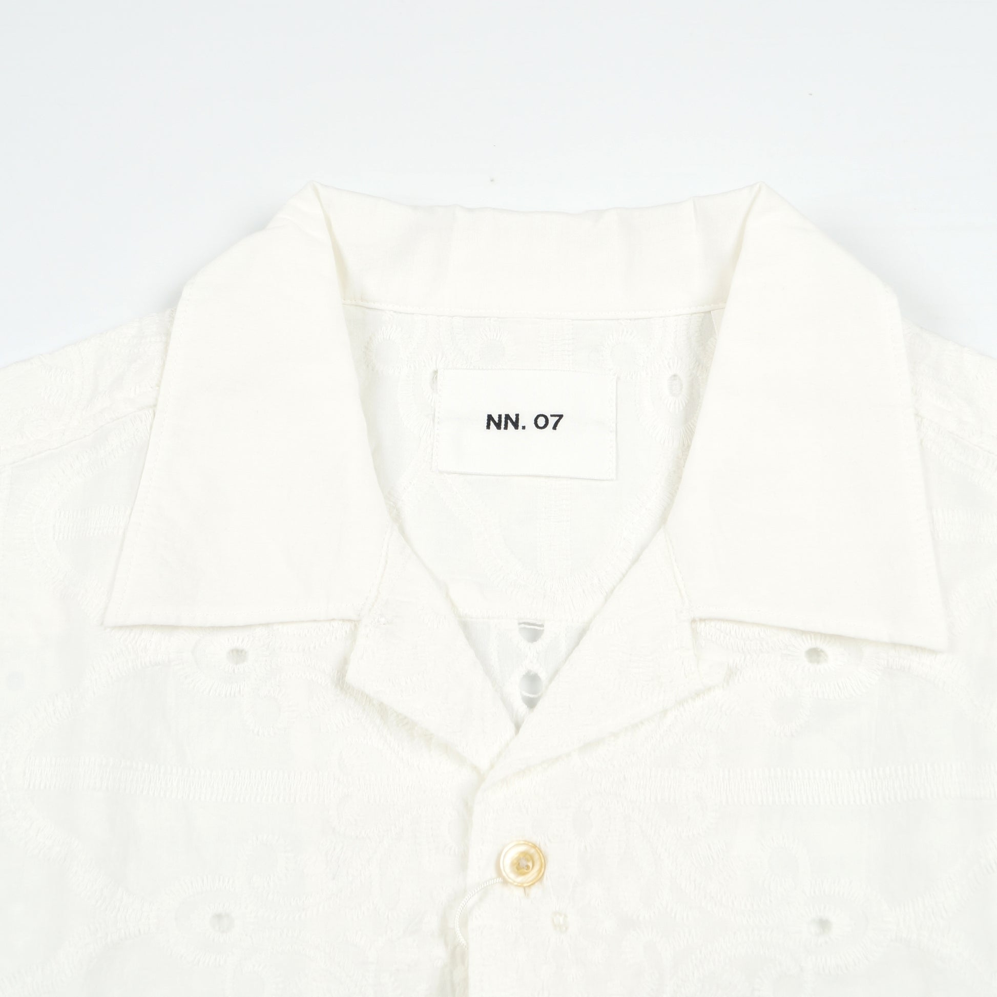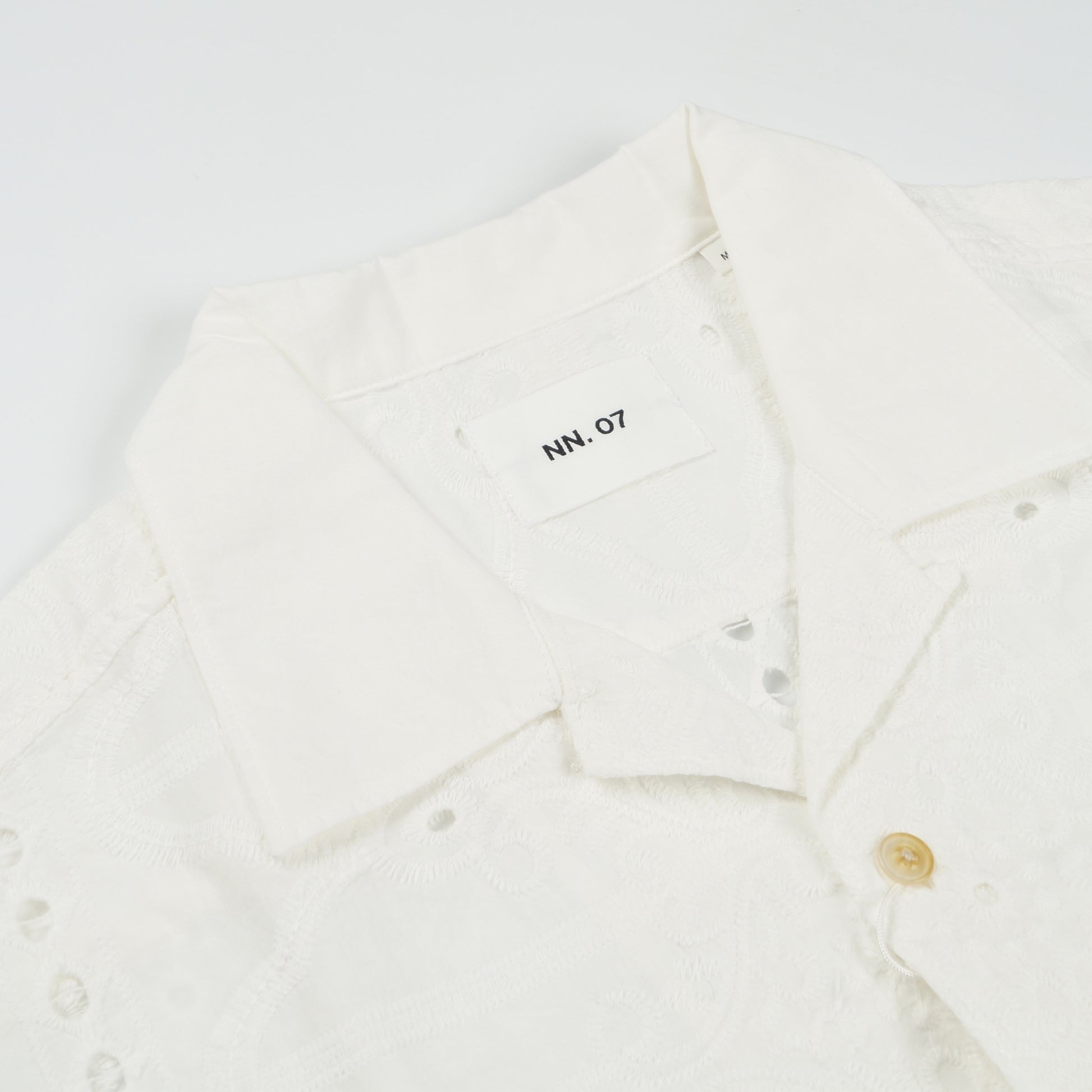 Founded by two friends in 2007, NN07 strives to change the modern to casual wardrobe. Based in Copenhagen however the brand strives to not to focus on nationalities rather personalities when it comes to their unique garments. Inspired by dedicated people and communities, the brand creates products with attention to the demands of today. This Julio shirt features an embroidered design with eyelets arranged in groups of floral patterns throughout, camp collared neckline and short sleeves. Wear this shirt with a pair of universal works trousers and some Hoff sneakers.