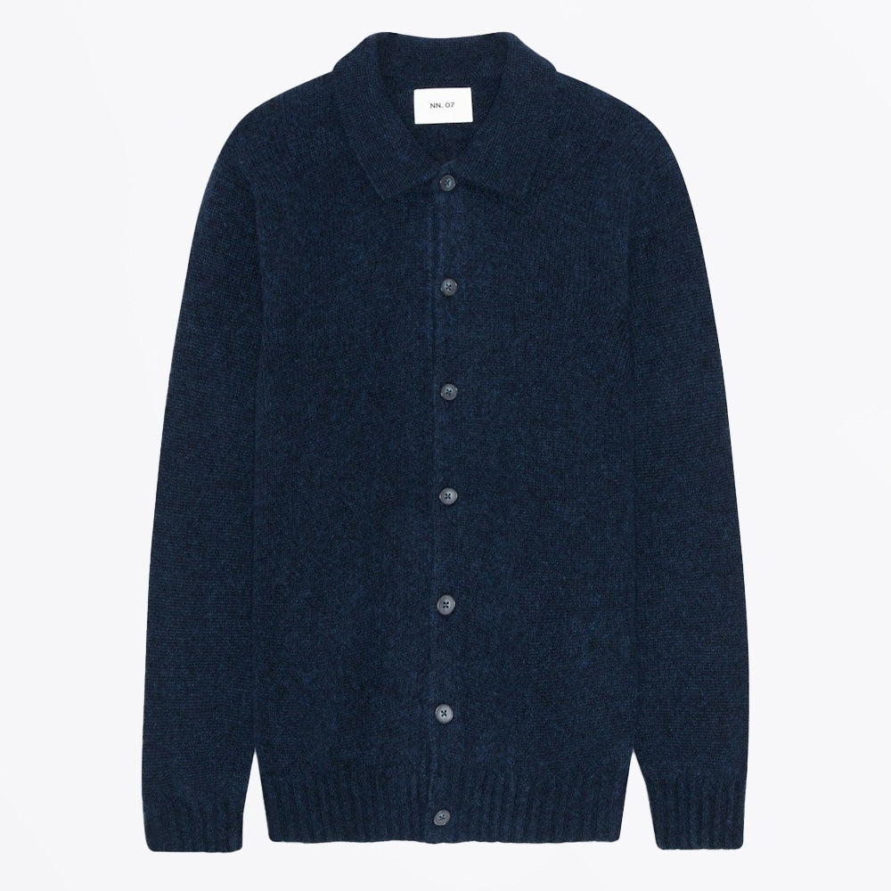 Founded by two friends in 2007, NN07 strives to change the modern to casual wardrobe. Based in Copenhagen however the brand strives to not to focus on nationalities rather personalities when it comes to their unique garments. Inspired by dedicated people and communities, the brand creates products with attention to the demands of today. This Lee cardigan features a button front, collar neckline, ribbed hem and cuffs, crafted in a navy fluffy textured yarn. Wear this with some NN.07 trousers and Hoff sneakers.