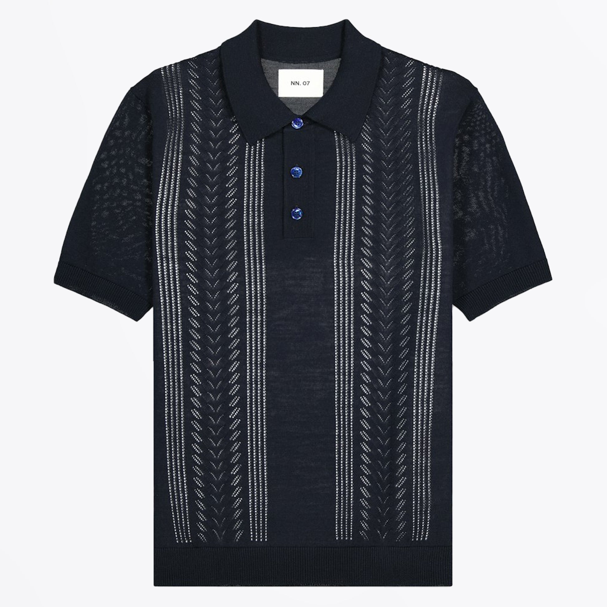 Founded by two friends in 2007, NN07 strives to change the modern to casual wardrobe. Based in Copenhagen however the brand strives to not to focus on nationalities rather personalities when it comes to their unique garments. Inspired by dedicated people and communities, the brand creates products with attention to the demands of today. This Thor knitted polo is crafted in a smooth wool and acrylic yarn blend an features a fine pointelle pattern on the front, collared neckline, half mother of pearl button fastening, ribbed hem and cuffs. Wear this polo with a pair of universal works trousers and some Hoff sneakers.