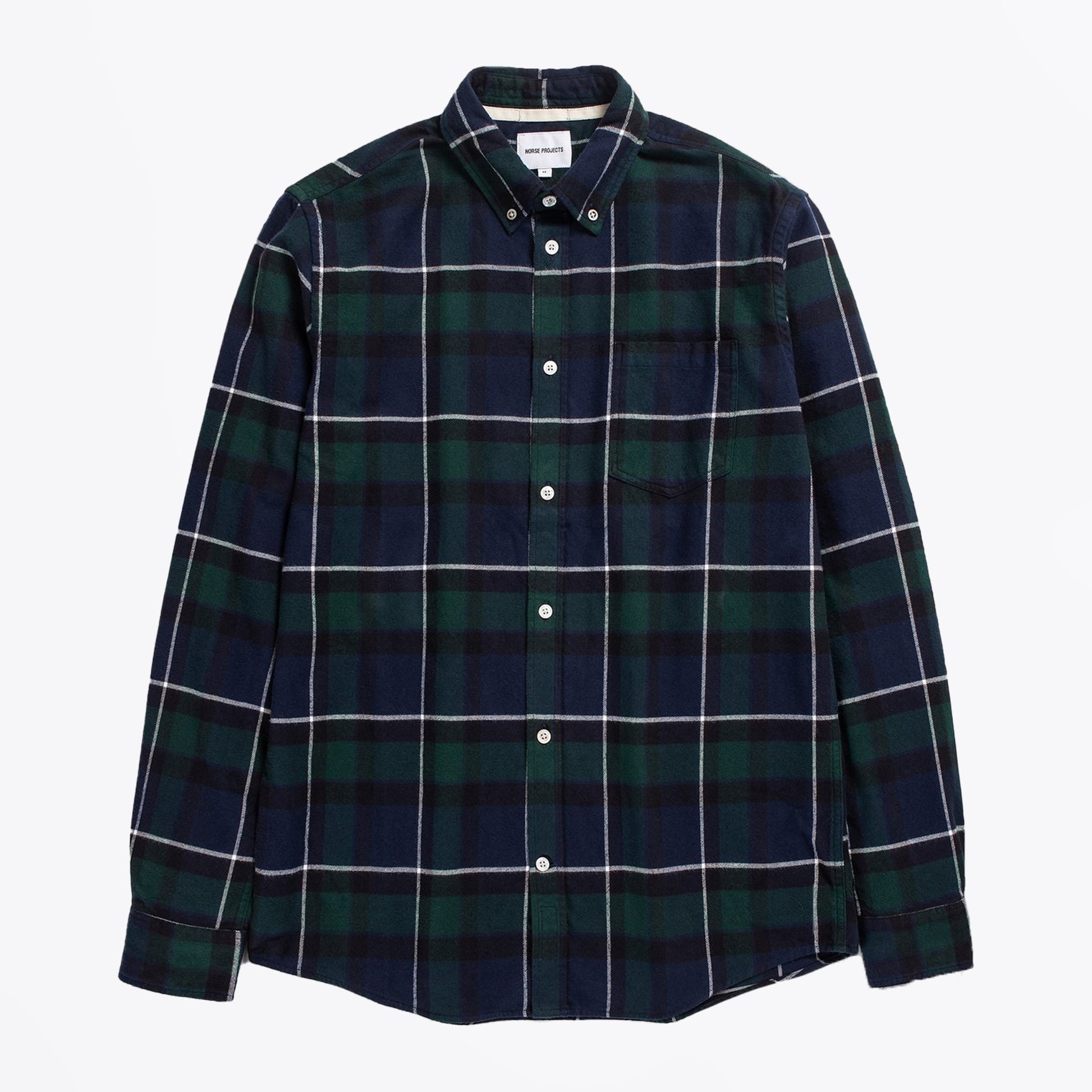 Norse Projects hails from one of the most exciting fashion influential and contemporary cities at the moment, Copenhagen. They fuse iconic Scandinavian style with their unique influences, creating a brand inspired by nature and modern street style. Adding some great winter fabrics to your shirt collection, this shirt features a checked design, crafted in a brushed cotton material. This shirt navy and green checked shirt has a white mother of pearl button-down fastening, with buttoned collar, buttoned cuffs, and a curved hem. Wear this shirt with a pair of Nudie Jeans and some designer trainers.