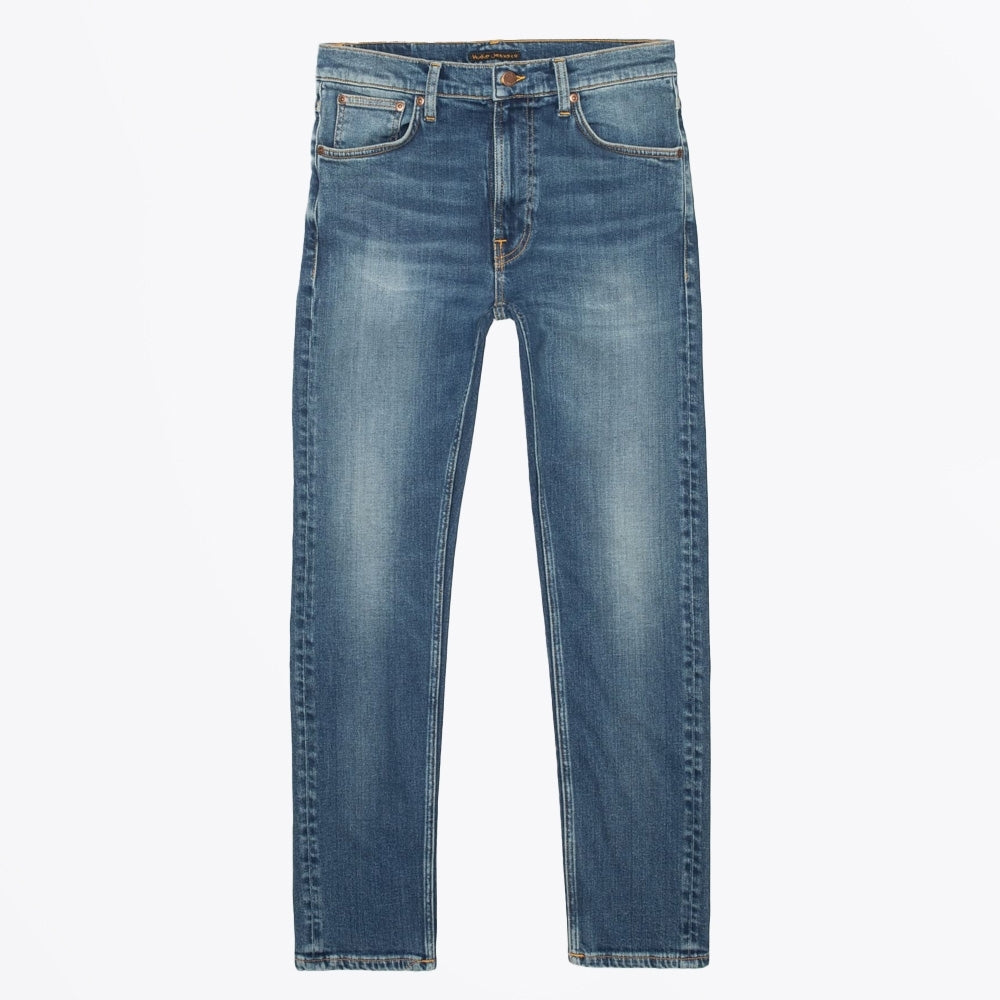 Based in Gothenburg, Nudie Jeans has specialised in premium denim since its foundation in 2001. The brand has an upbeat, youthful edge, underscored by its stylish designs. Their jeans are intended to be worn daily so that the denim will build up its own characteristics based on your lifestyle. This pair of handmade jeans are made in comfort stretch denim. These jeans are made from a mid blue denim. They have a slim tapered fit that tapers evenly from the hip down to the ankle, an aspect that has made Lean Dean one of our most popular fits. Features of these jeans include five riveted pockets, silver embossed top button, looped waist, signature hardware buttons, zip fly, black threads on all seams, antique silver trims and special jacron patch with embossed font.