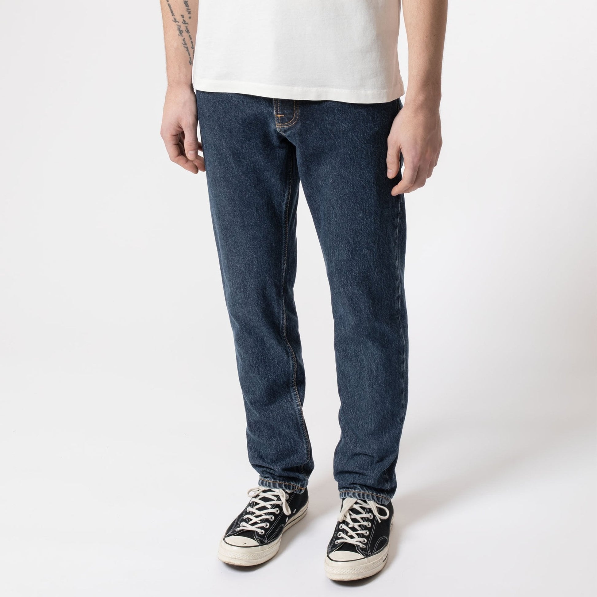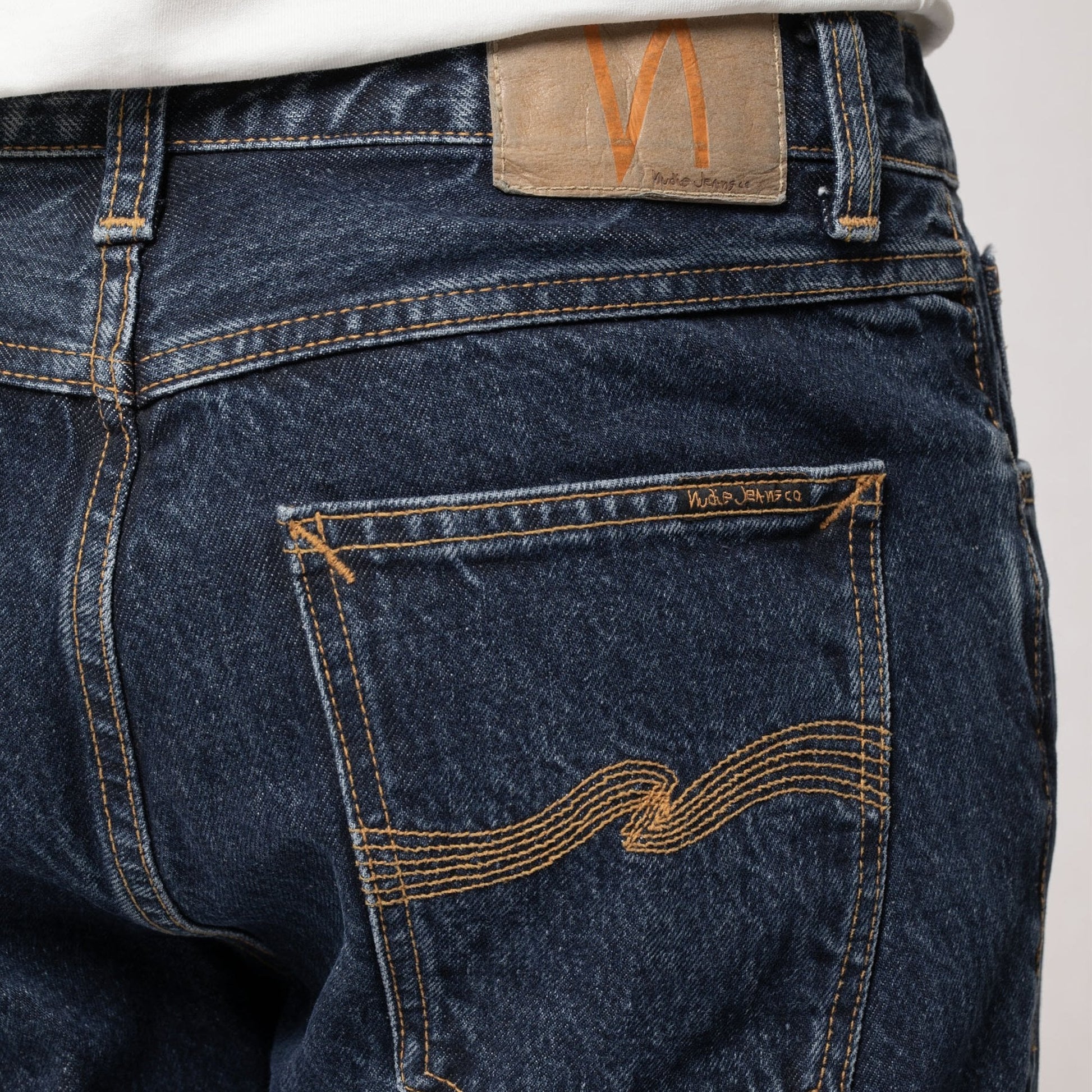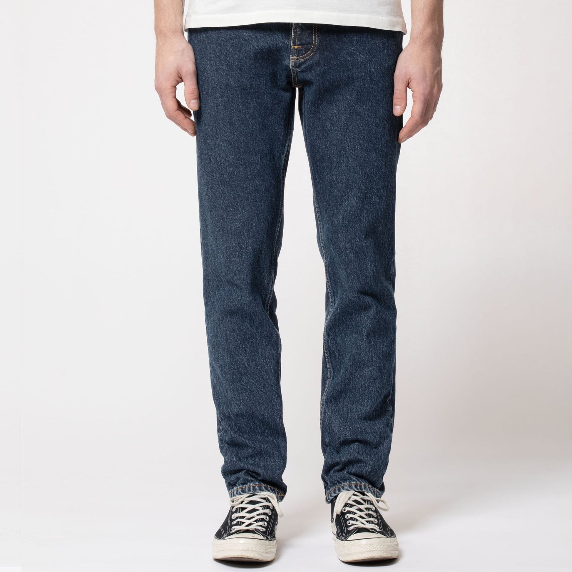 Based in Gothenburg, Nudie Jeans has specialised in premium denim since its foundation in 2001. The brand has an upbeat, youthful edge, underscored by its stylish designs. Their jeans are intended to be worn daily so that the denim will build up its own characteristics based on your lifestyle. These regular fit jeans are crafted from a plain stonewash denim on an indigo dye, giving the jeans a great marbled texture effect. These jeans have orange topstitching on the seams, with copper coloured hardware, side pockets, back pockets and a faded leather patch at the back waistband. Wear these jeans as a part of your daily casual wardrobe and style with some designer trainers.