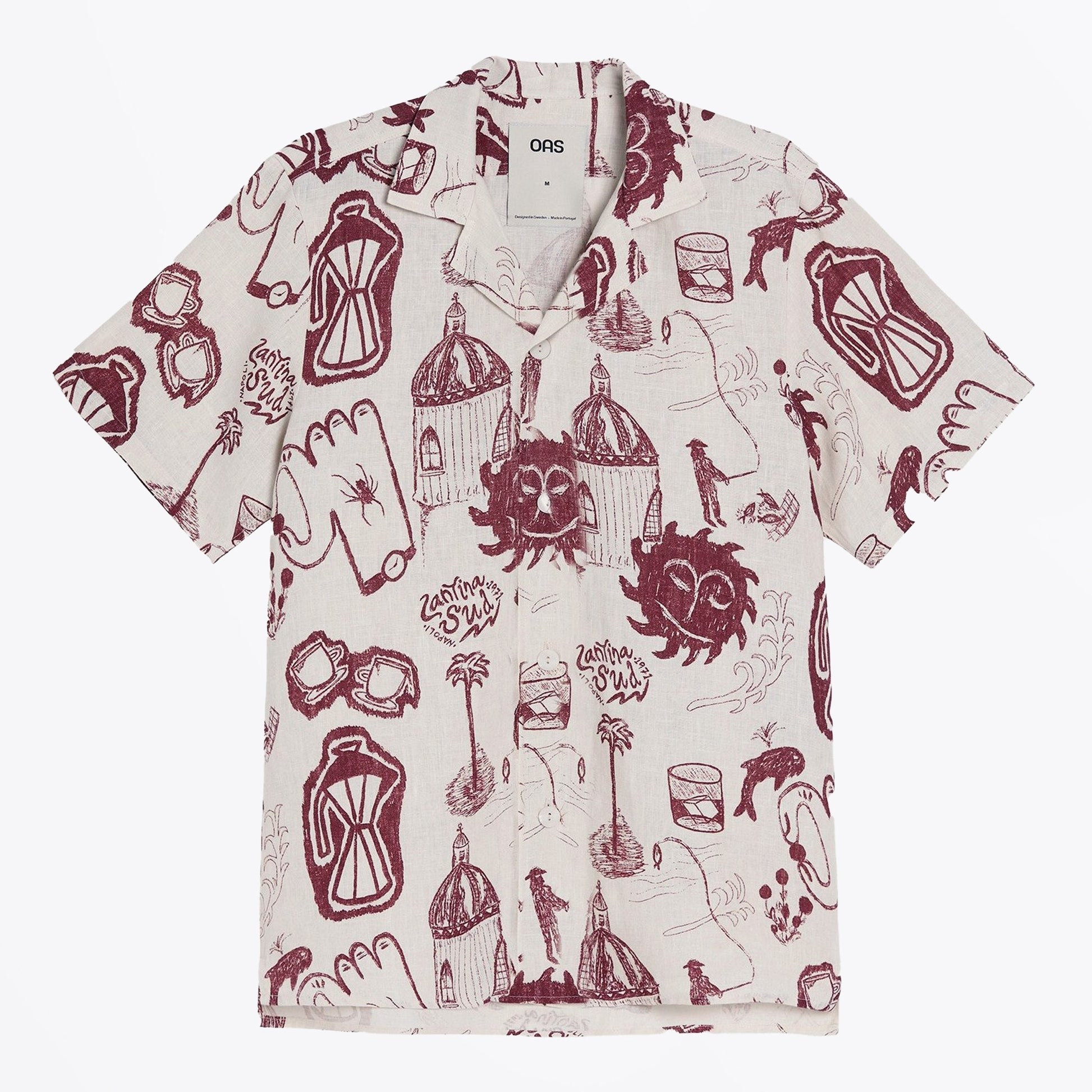 With a resort collar and button-front closure, it features a unique print inspired by travel diary scribbles—capturing a collage of fleeting thoughts and memories.