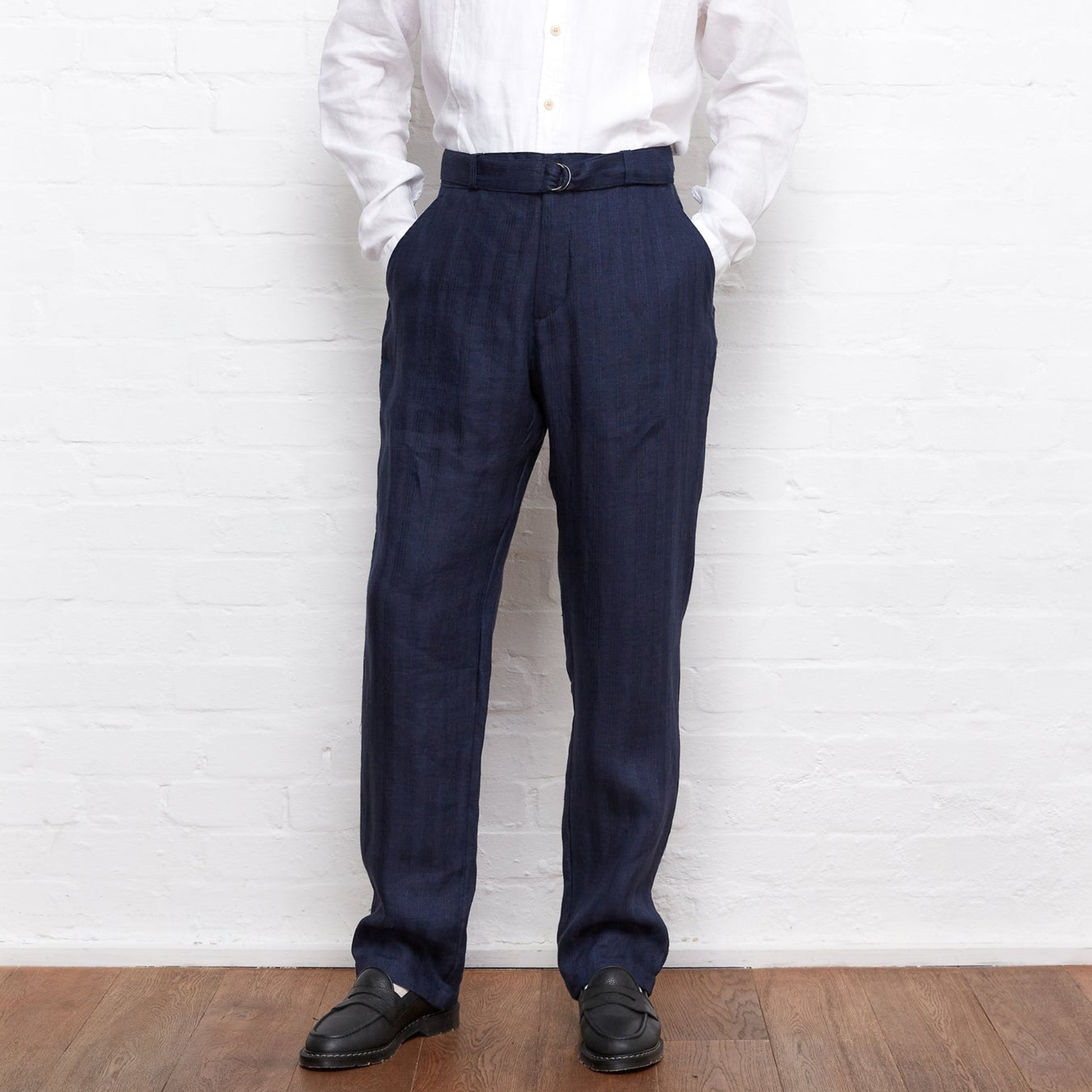 Fast becoming a staple brand at Mr & Mrs Stitch, Oliver Spencer, is a London-based designer that bridges the gap between popular streetwear and traditional tailoring. The brand combines an environmentally sustainable approach to design along with high quality tailoring to create a modern British aesthetic. Add a relaxed style to your trouser collection with these Linen trousers from Oliver Spencer. These Navy trousers feature side pockets, a buttoned fly with a zip fastening, rear patch pockets and a belt buckle fastening on the front. Wear these trousers with a Universal Works white shirt and some Grenson loafers.