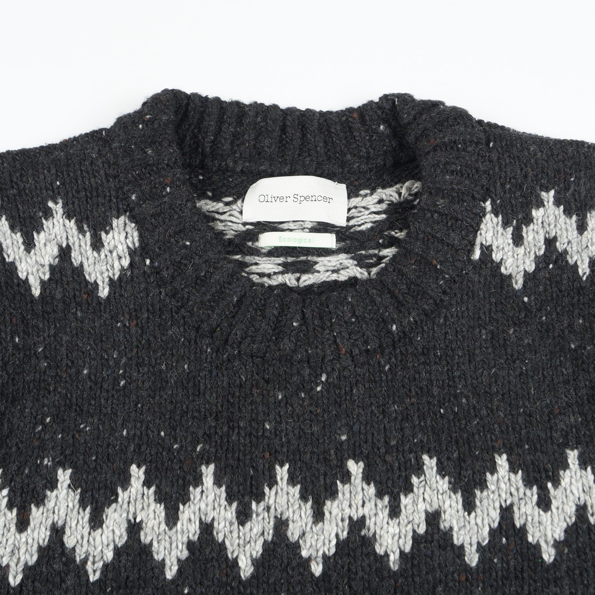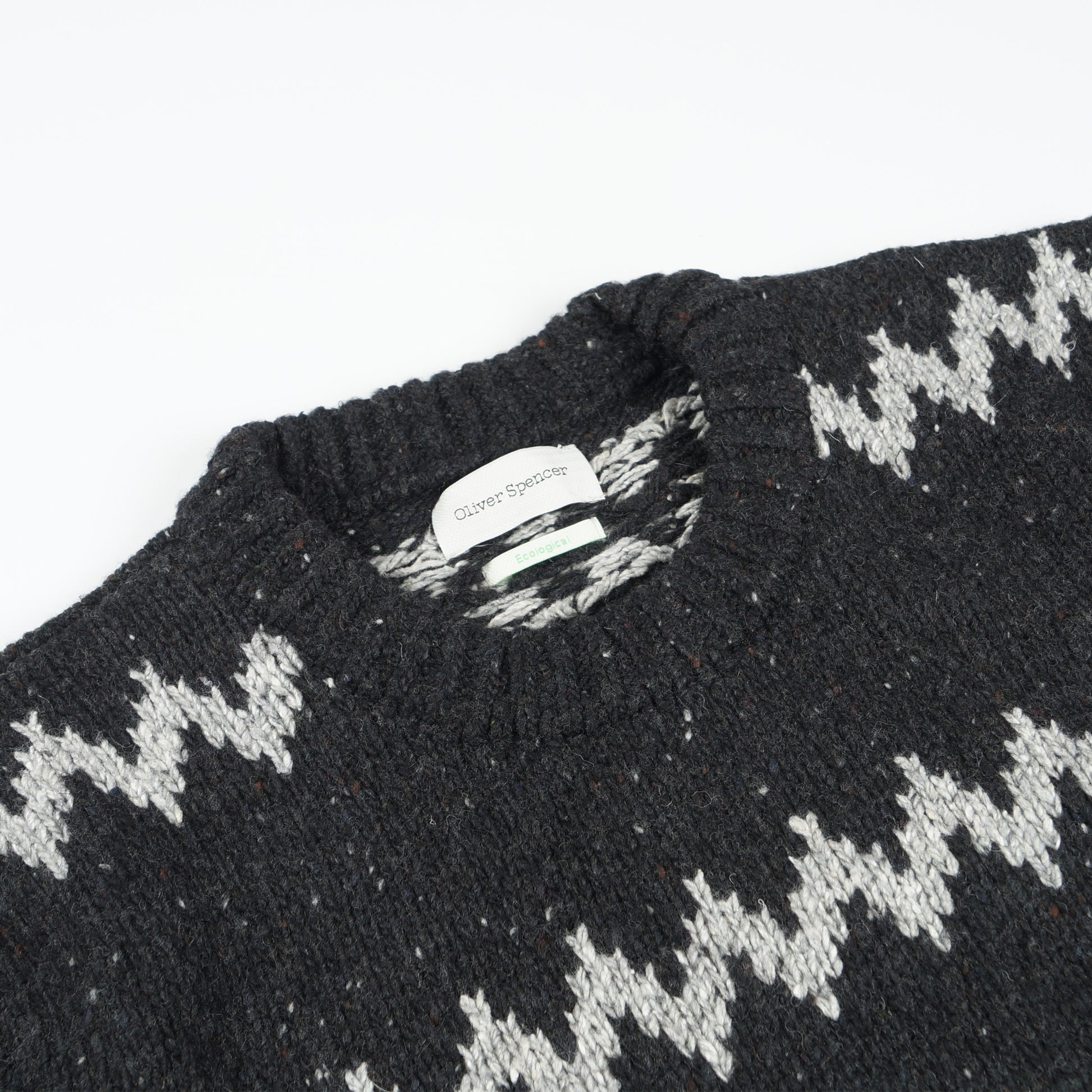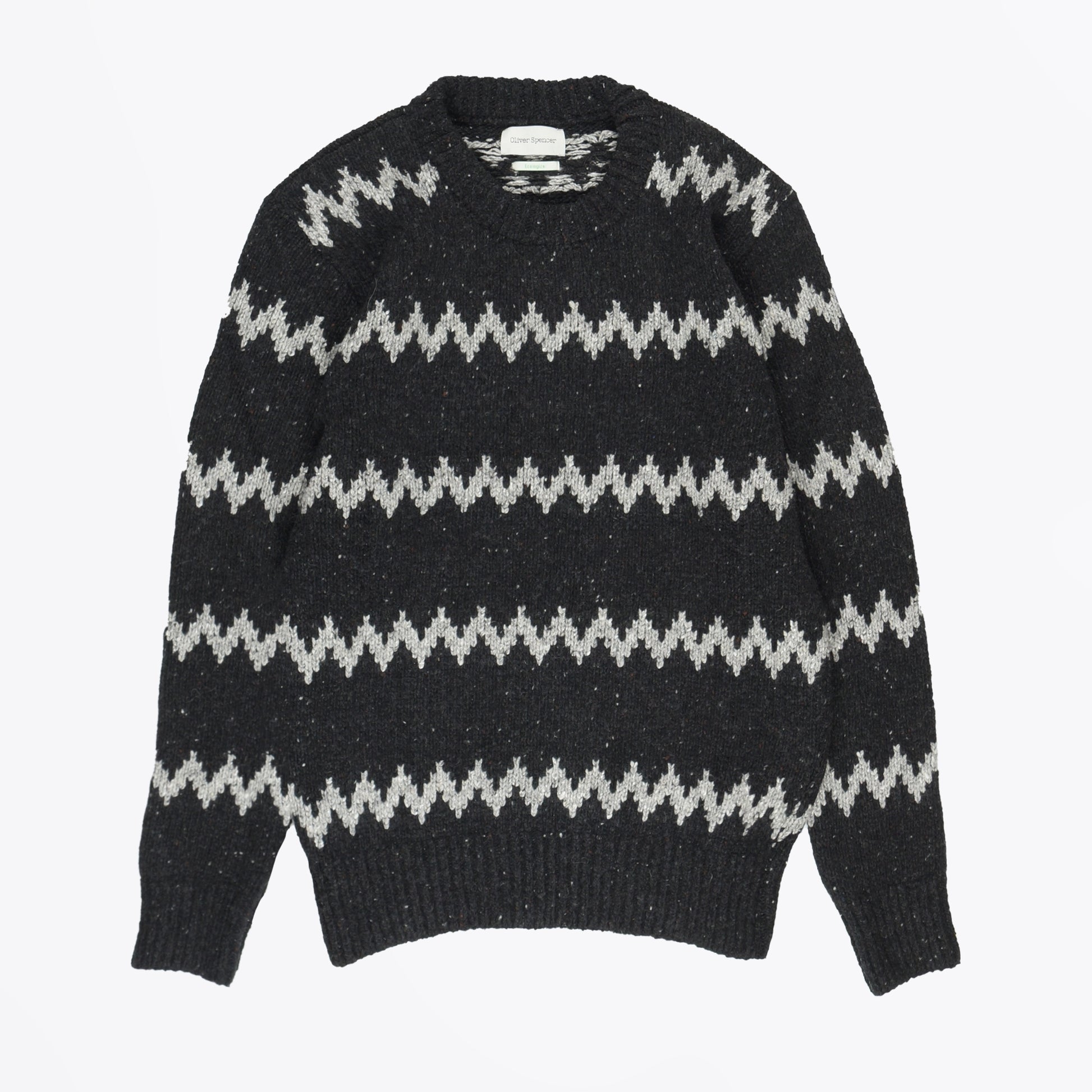 Fast becoming a staple brand at Mr & Mrs Stitch, Oliver Spencer, is a London-based designer that bridges the gap between popular streetwear and traditional tailoring. The brand combines an environmentally sustainable approach to design along with high quality tailoring to create a modern British aesthetic. A terrific choice for a smart winter style, this Oliver Spencer knitwear piece features a zig zag slate coloured design, crew neckline, ribbed hem and cuffs. Wear this piece of knitwear with a pair of designer trousers and some designer trainers.