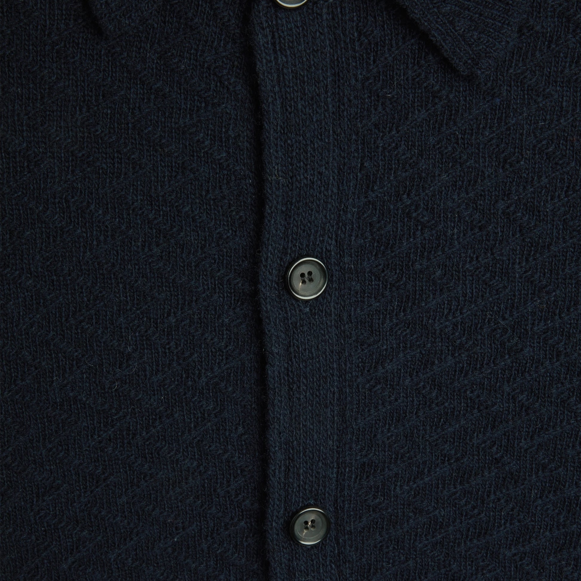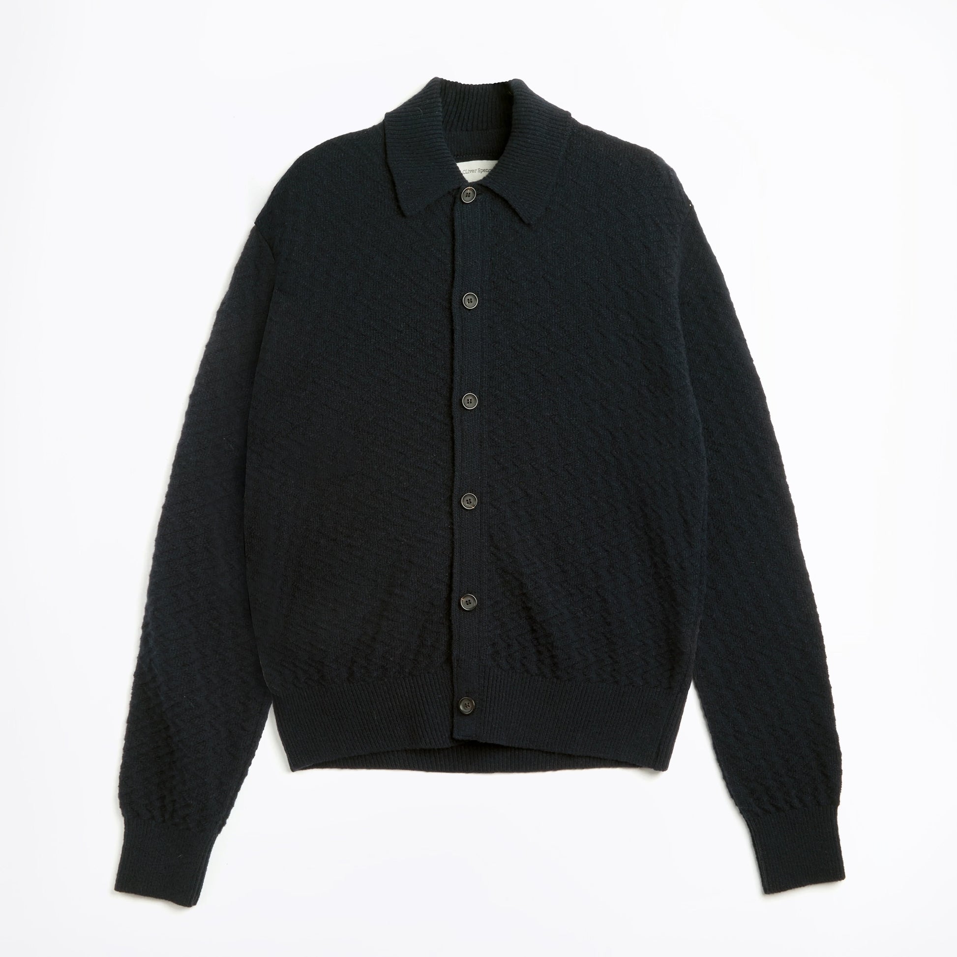 Elevate your autumn wardrobe with the Britten Button-Down Collared Wool Cardigan. Crafted from 100% extrafine wool, this navy textured cardigan offers a luxurious feel and versatile style. Perfect for smart-casual layering, the Britten transitions effortlessly from office meetings to relaxed weekend outings.