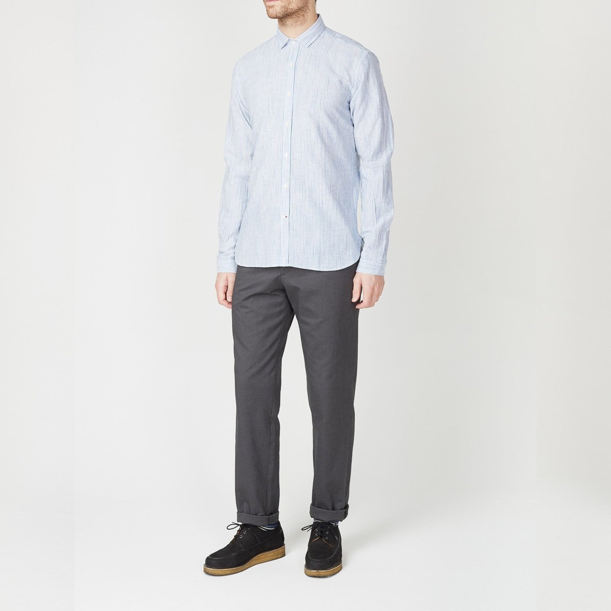 One of our newest labels, Oliver Spencer, is a London-based designer that bridges the gap between popular streetwear and traditional tailoring. The brand combines an environmentally sustainable approach to design along with high quality tailoring to create a modern British aesthetic. This lightweight shirt is constructed in a slub stripe cotton for a durable and breathable finish. This style of shirt has a great handle and drape and is finished with detailing such as a slim, square collar that conceals a tab fastening, button cuff and signature red bar-tacked button hole. This shirt is versatile enough to suit all occasions.