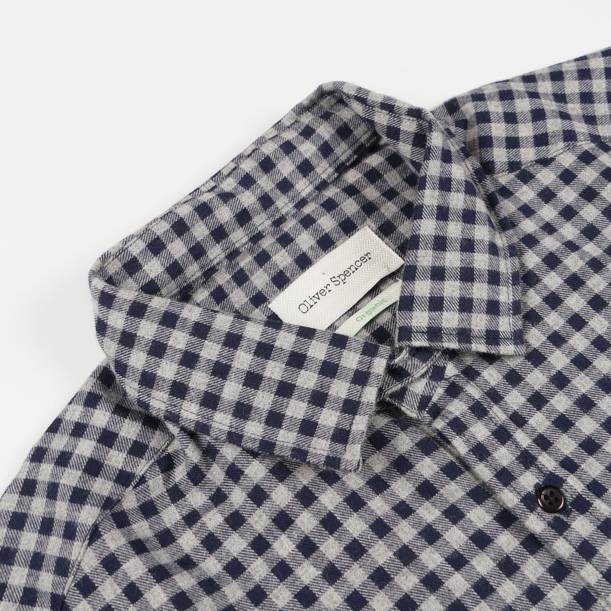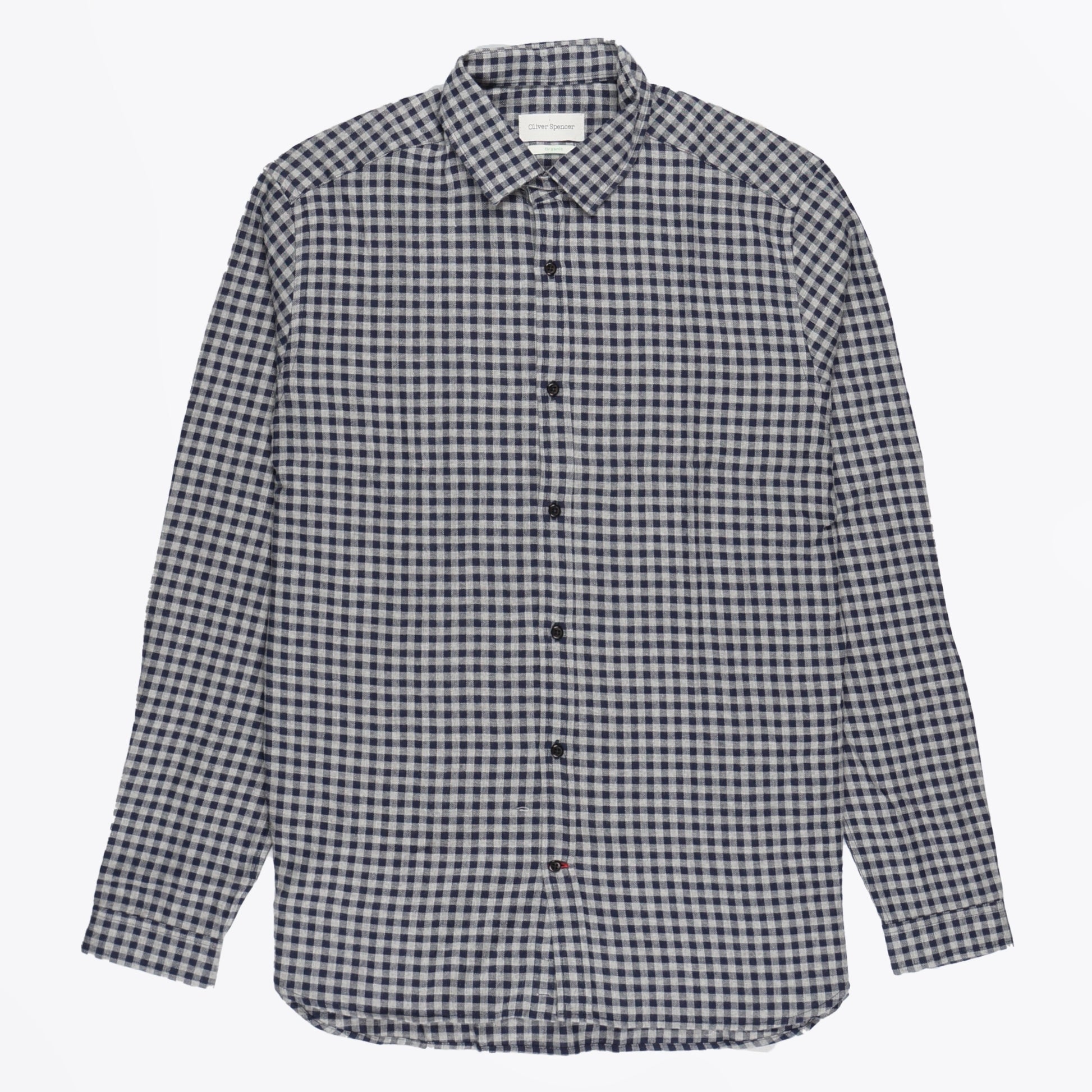 Fast becoming a staple brand at Mr & Mrs Stitch, Oliver Spencer, is a London-based designer that bridges the gap between popular streetwear and traditional tailoring. The brand combines an environmentally sustainable approach to design along with high quality tailoring to create a modern British aesthetic. Enhance your weekend shirt options with a touch of British style. This shirt is crafted from a slight brushed cotton fabric with a navy and grey checked design. This shirt features a collared neckline, with an optional fastening tab, buttoned cuffs, a navy button-down fasting, and a contrasting red buttonhole at the bottom. Wear this shirt with a pair of MMX trousers.