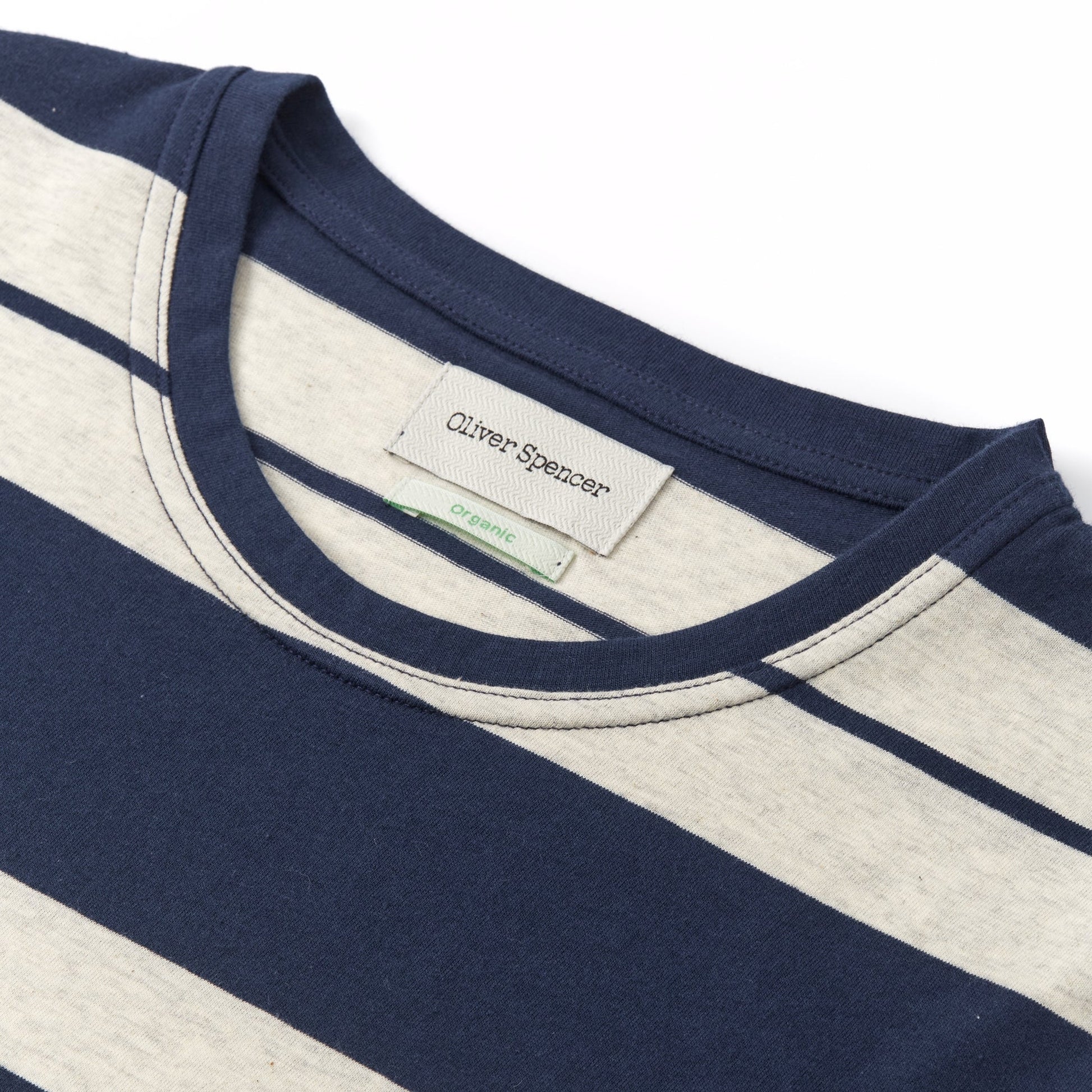 Fast becoming a staple brand at Mr & Mrs Stitch, Oliver Spencer, is a London-based designer that bridges the gap between popular streetwear and traditional tailoring. The brand combines an environmentally sustainable approach to design along with high quality tailoring to create a modern British aesthetic. A terrific choice for a smart summer style, this Oliver Spencer t-shirt has a navy/beige striped design and features short sleeves, crew neckline, ribbed hem, and cuffs. Wear this shirt with a pair of Universal Works trousers and a pair of Paul Smith sneakers.