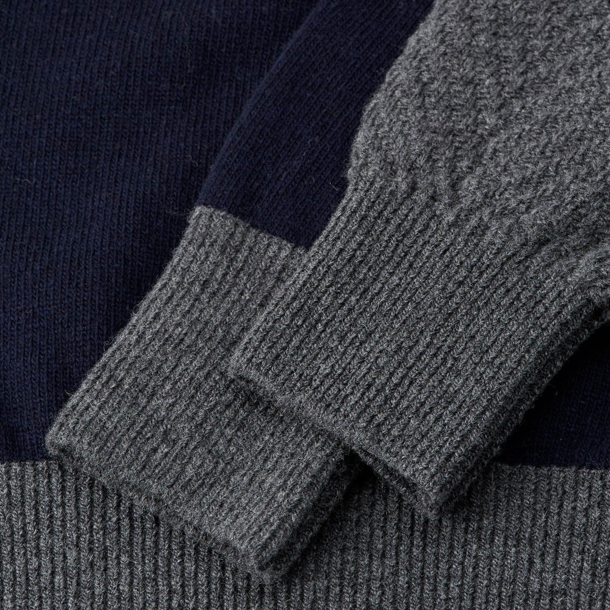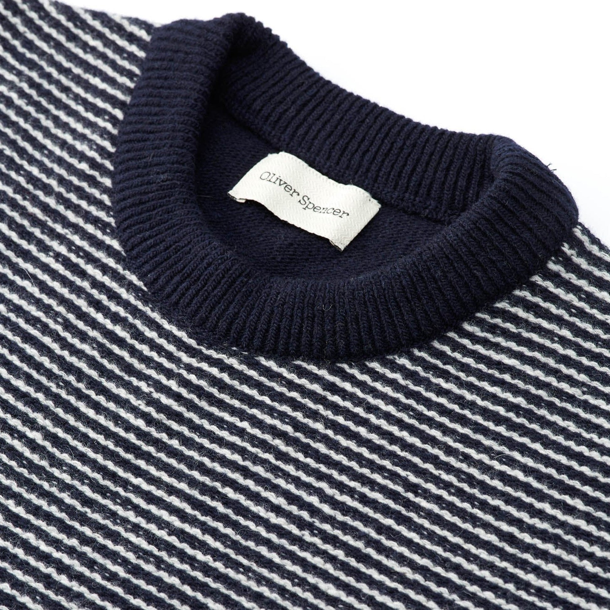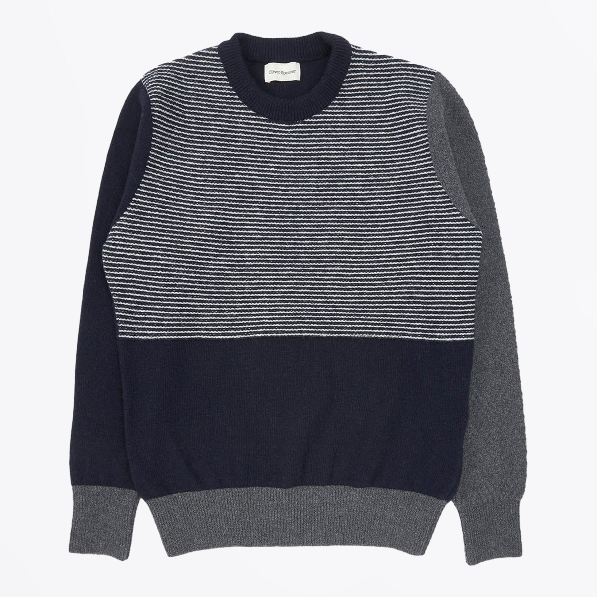 Fast becoming a staple brand at Mr & Mrs Stitch, Oliver Spencer, is a London-based designer that bridges the gap between popular streetwear and traditional tailoring. The brand combines an environmentally sustainable approach to design along with high quality tailoring to create a modern British aesthetic. Add some interesting design to your knitwear this season with a wool jumper. This jumper features a mixed panel knit design, with mismatched sleeves, ribbed hem and cuffs, and a thick ribbed neckline. Wear this jumper with a pair of straight leg jeans and some designer trainers.