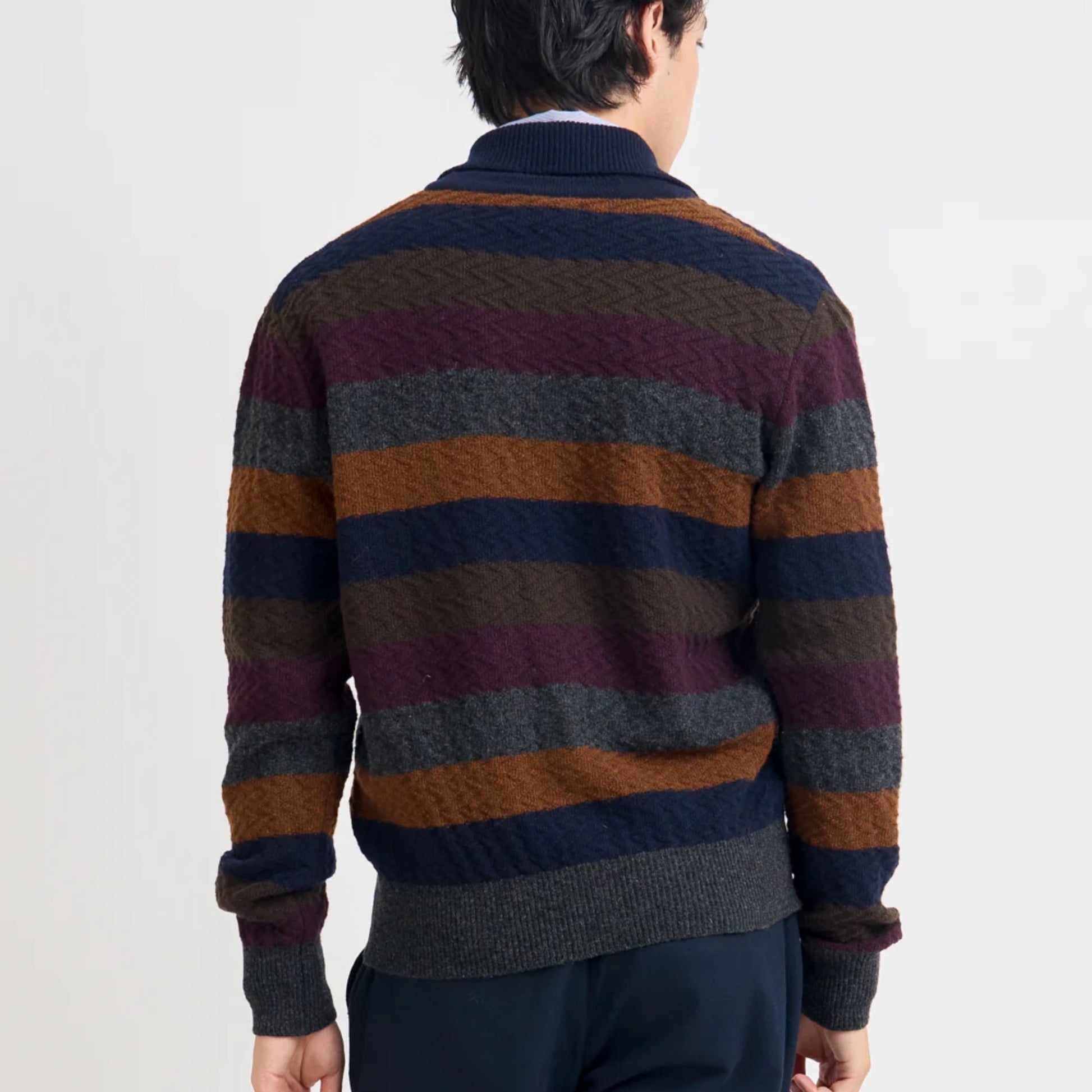 Elevate your autumn wardrobe with the Britten Striped Wool Cardigan, a luxurious multi-colour piece crafted from 100% extrafine wool. Featuring a classic button-down collar and a rich textural weave, this versatile cardigan effortlessly bridges smart and casual styles. Perfect for layering over shirts or under jackets, the Britten offers both comfort and sophistication for cooler months.