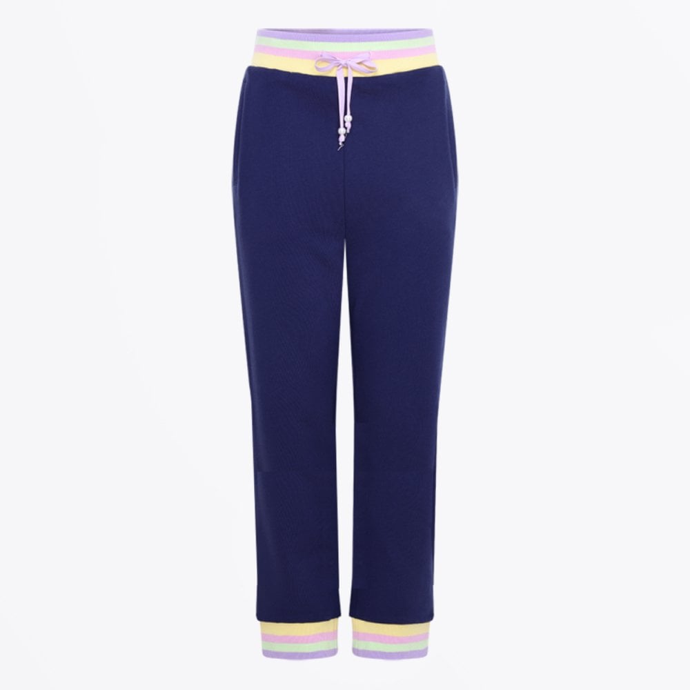Jersey joggers in navy with pastel stripe ribbing. The Arden joggers are a wide leg fit and are finished with small pearls at the end of the drawstrings.