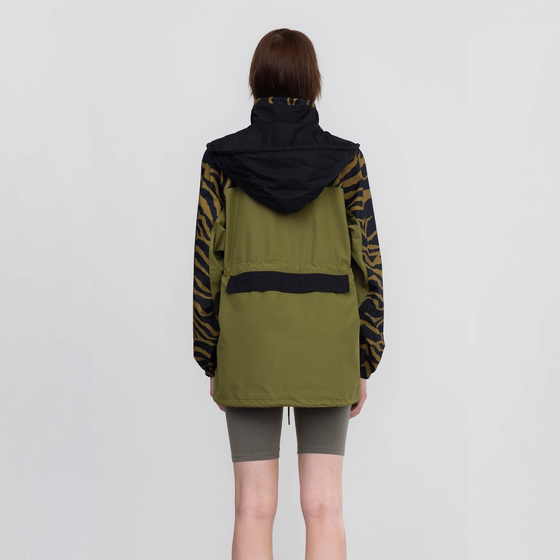 Outwear label, OOF WEAR created in 2016 offers the ultimate outerwear that provides comfort, warmth and protection. OOF Wear creates classics for women that are reinterpreted crafting new silhouettes and materials in contrast with each other that are mixed with nuances and sophisticated patterns.This women's waterproof anorak will have you looking stylish and dry throughout the year. This practical jacket features a soft fit with a kimono-style sleeve and zebra print details. This anorak closes with a heat-sealed anti-rain zip, has a hood hidden in the neck and an adjustable drawstring on the bottom, waist and neck. Finished with front patch pockets with velcro fastenings and cuffs closed with hidden elastic.The entire garment is thermo welded into the inner seams and it can be packed up through the pocket on the back. Super practical and comfortable for the wearer for all day-to-day occasions.