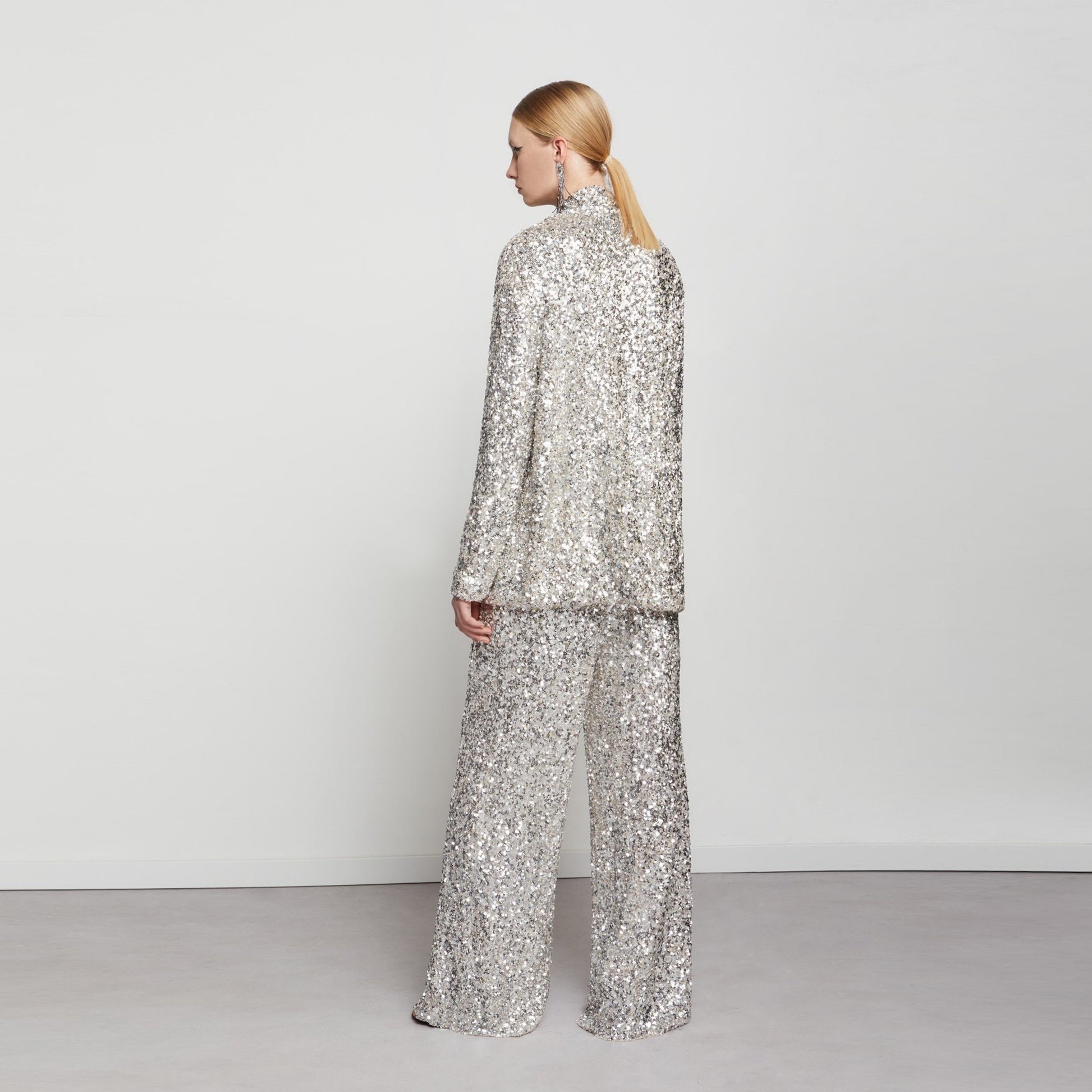 An Italian breath of life to womenswear, Ottod’Ame has one vision, which is to bring strong, elegant, and fresh designs to the market. Add a great pop of colour your wardrobe this season with a skirt from Ottod’Ame. A great staple in any wardrobe, this jacket is crafted with luxury sequin polyester material in a stunning silver, collared neckline, and matching lapels. Wear this with the matching sequin trousers.
