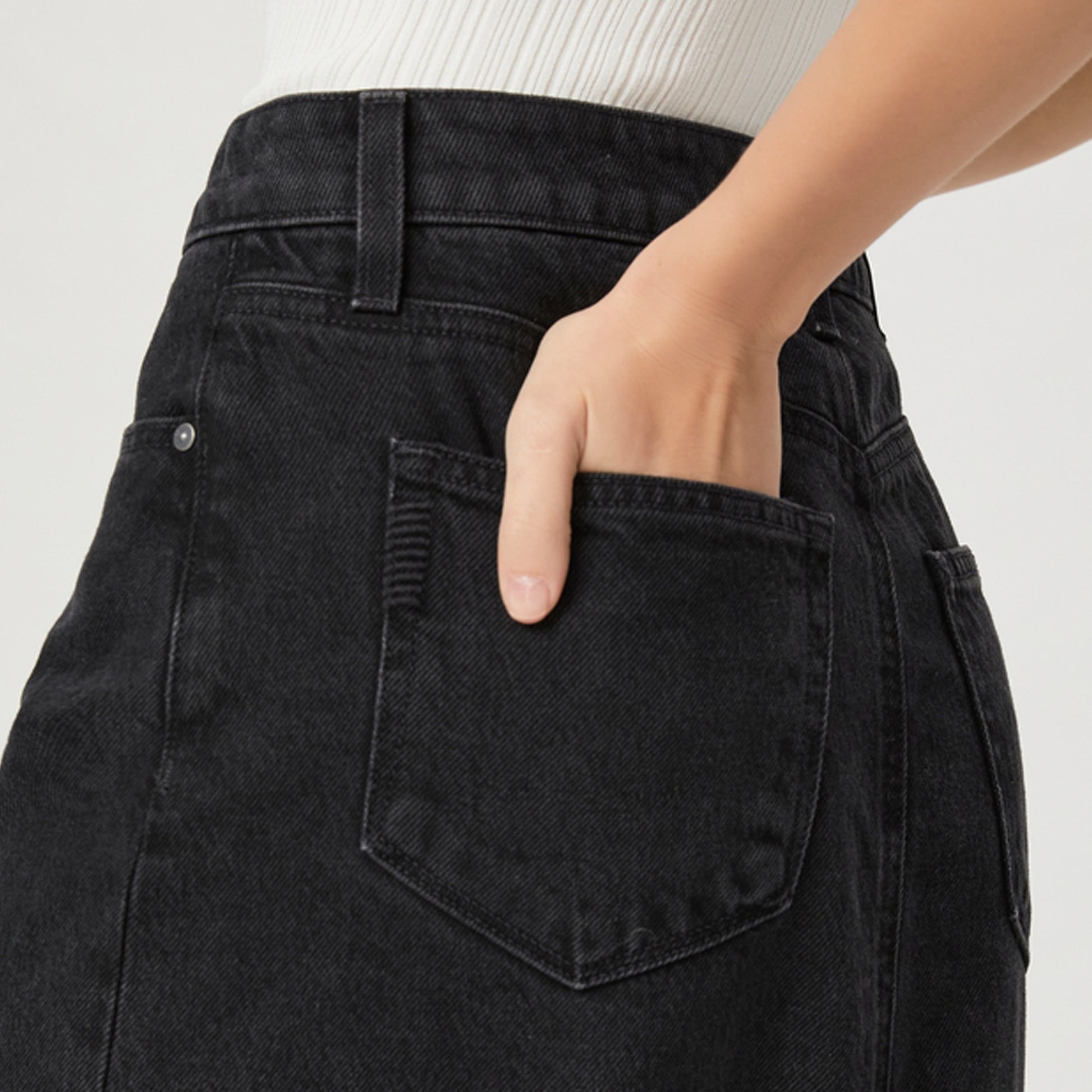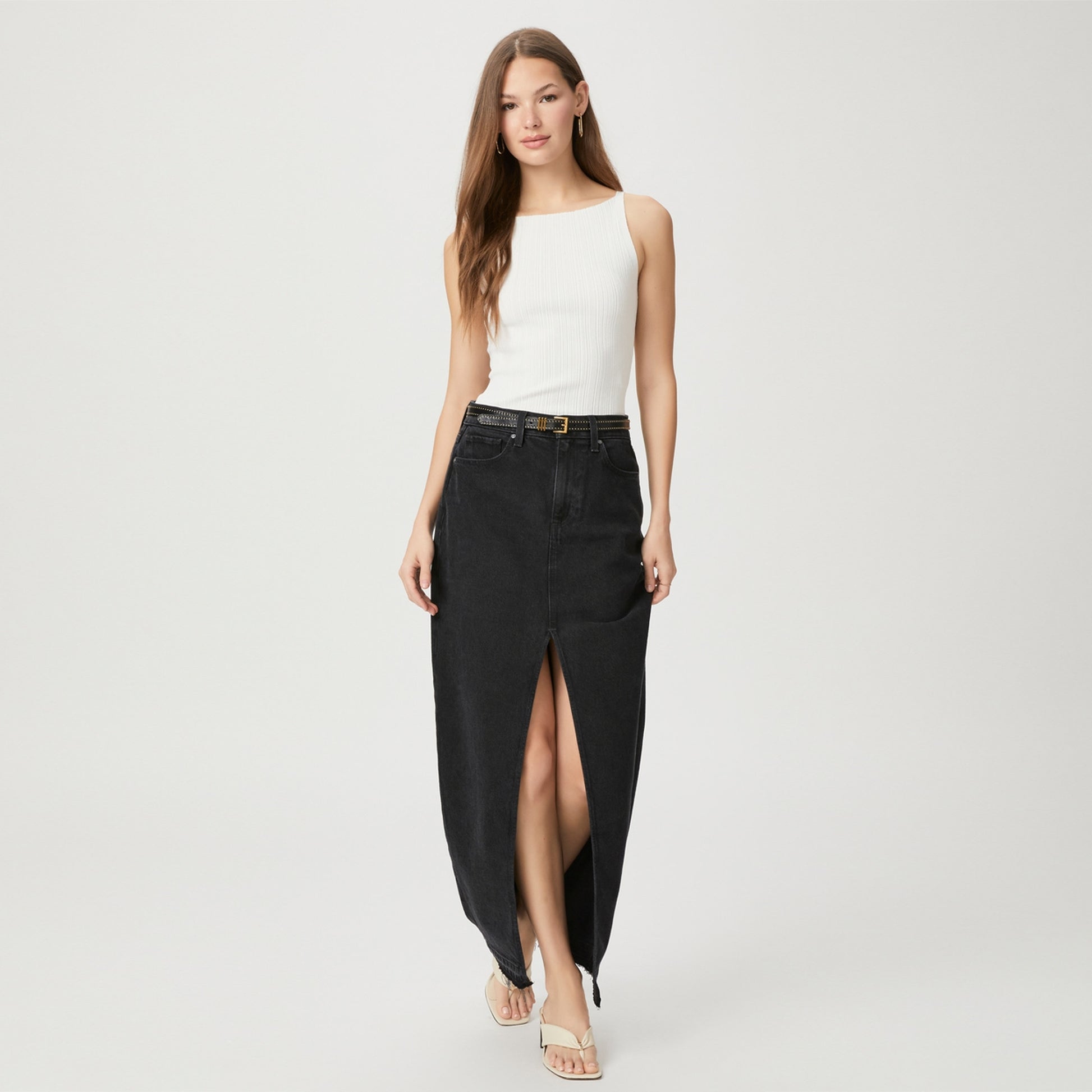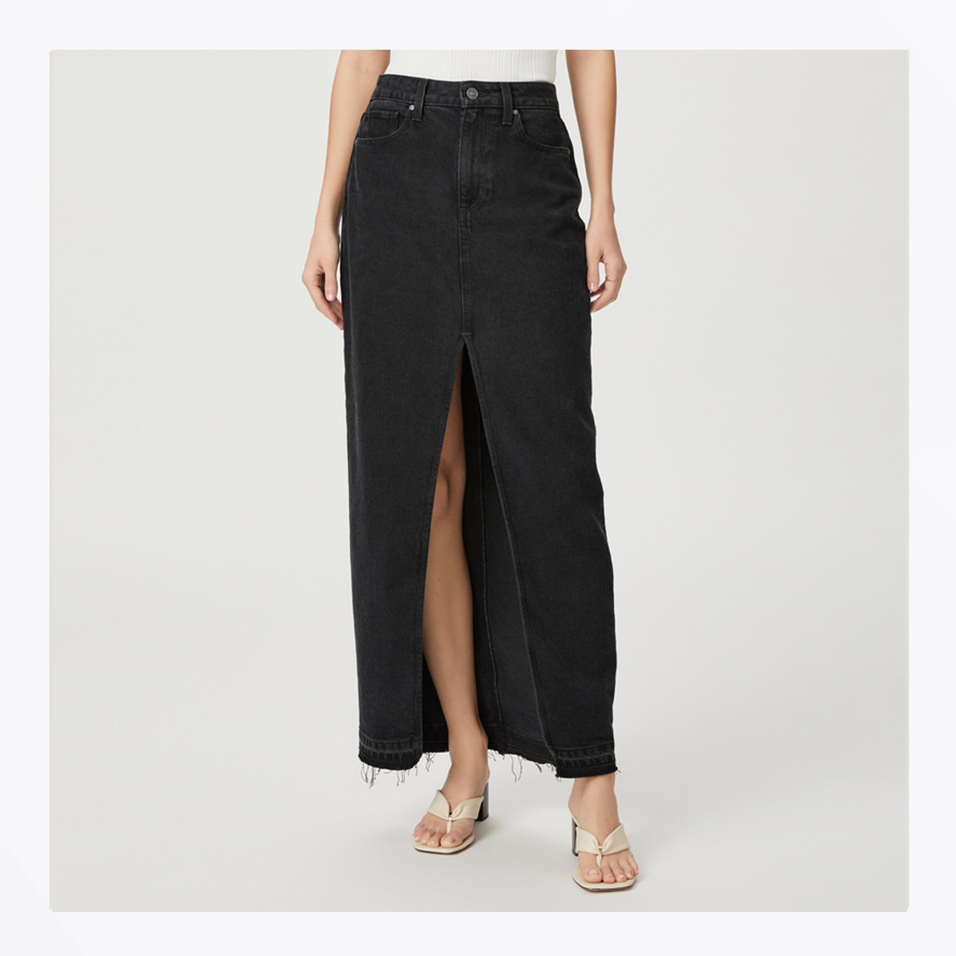 PAIGE is a California lifestyle collection for men and women. The women’s collection is made up of denim that takes you from morning to moonlight, feminine blouses, effortlessly chic dresses, edgy leather toppers and everything in between. These jeans are a great way to bring a luxurious feel to your wardrobe. This flattering, Angela maxi skirt is crafted in a cotton material. Crafted In a black wash with a let down hem, this skirt features a 5-pocket style, belt loops, slit up the front and silver hardware with a patch featuring the Paige logo on the back. Wear this skirt with an American Vintage knit and a pair of Mexicana boots.