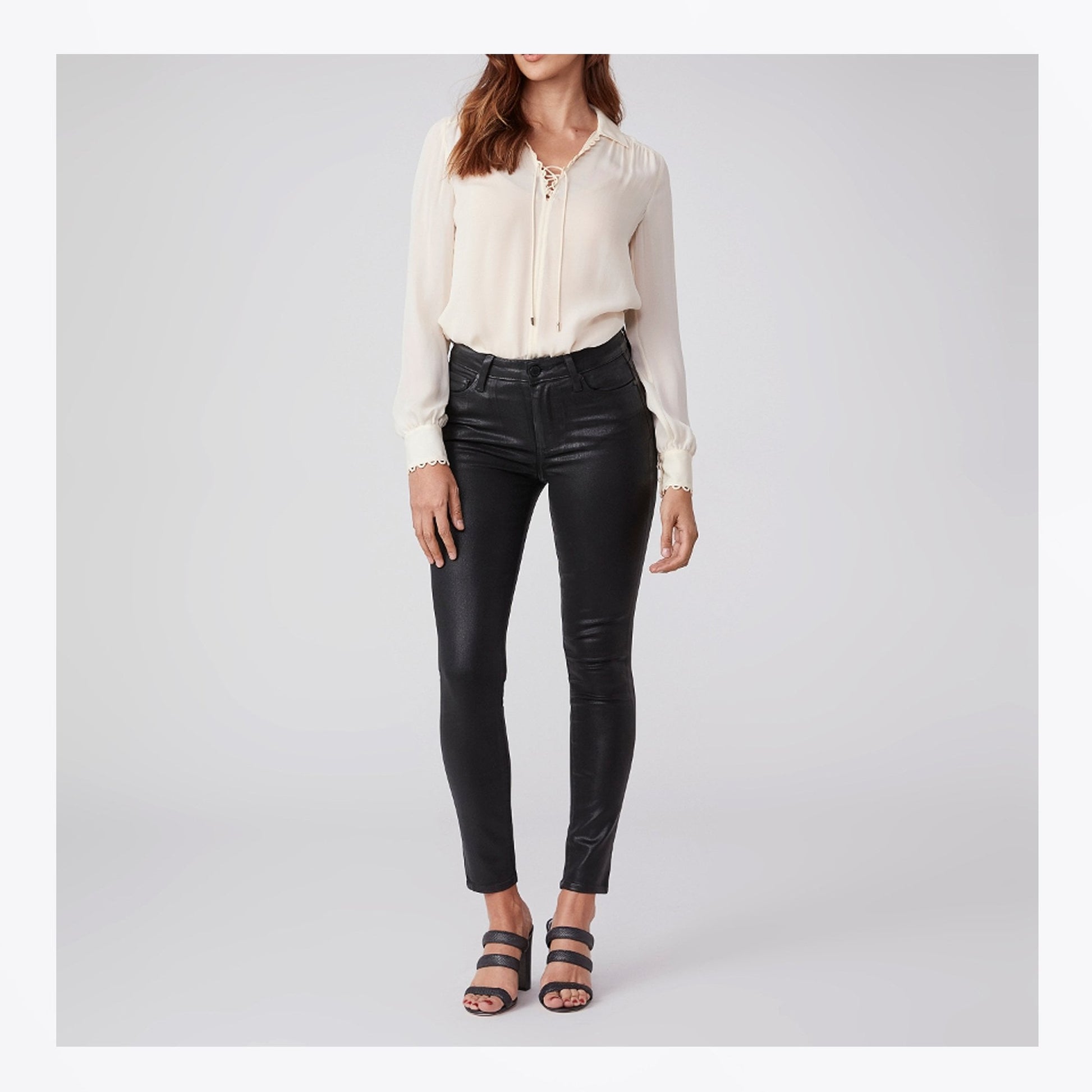 PAIGE is a California lifestyle collection for men and women. The women’s collection is made up of denim that takes you from morning to moonlight, feminine blouses, effortlessly chic dresses, edgy leather toppers and everything in between. These jeans are a great way to bring a luxurious feel to your wardrobe. A cropped ankle length in our signature high-rise ultra skinny, the Hoxton Ankle is fitted from the hip to the leg opening. This super flattering style has a leather-like look, but doesn't sacrifice comfort. Cut from our coated TRANSCEND denim in rich black, this style is luxuriously soft with plenty of stretch and recovery to give it a flawless fit from morning to moonlight.
