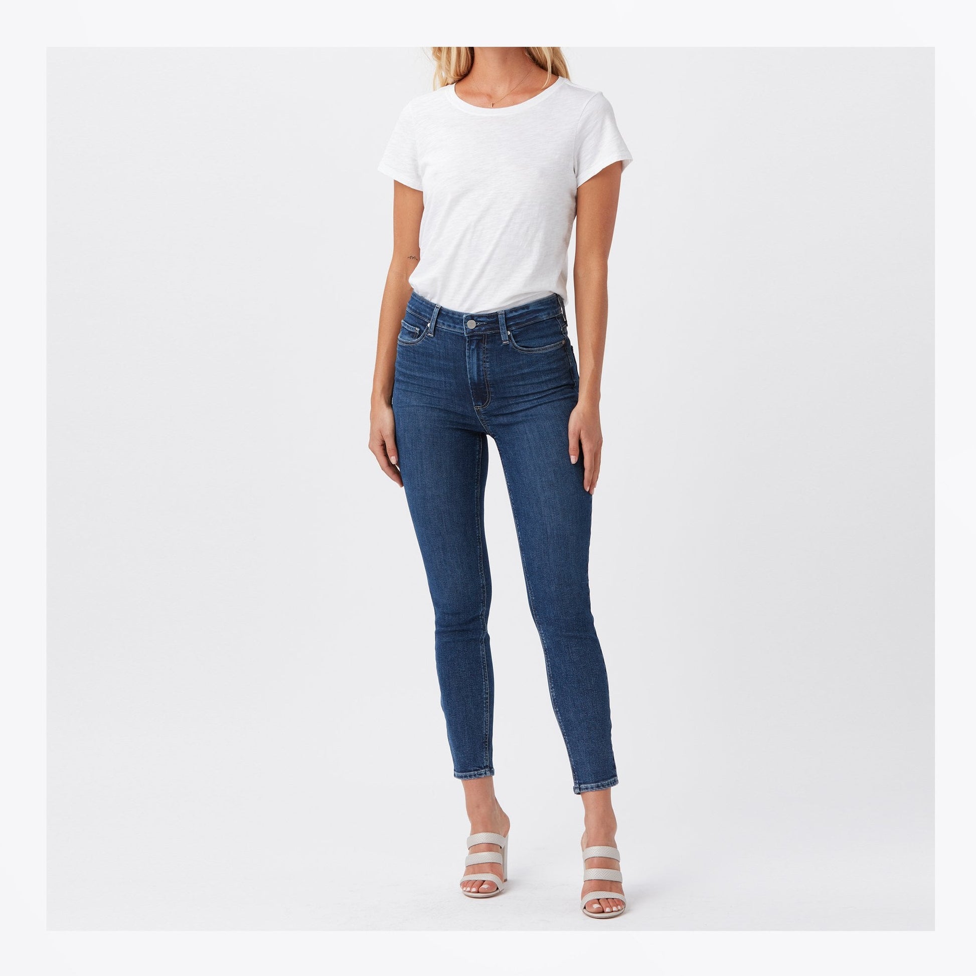 PAIGE is a California lifestyle collection for men and women. The women’s collection is made up of denim that takes you from morning to moonlight, feminine blouses, effortlessly chic dresses, edgy leather toppers and everything in between. This style offers the perfect high-waisted skinny in Paige's collection with our highest-rise, ultra skinny leg opening and cropped ankle length. Cut from our TRANSCEND VINTAGE denim in a rich, vintage-inspired wash, this style has the look of authentic vintage denim but is incredibly comfortable with plenty of stretch and recovery. Features include belt loops, five pockets, branded hardware and leather brand patch at back waistband. Pair with chunky biker boots for the new season.
