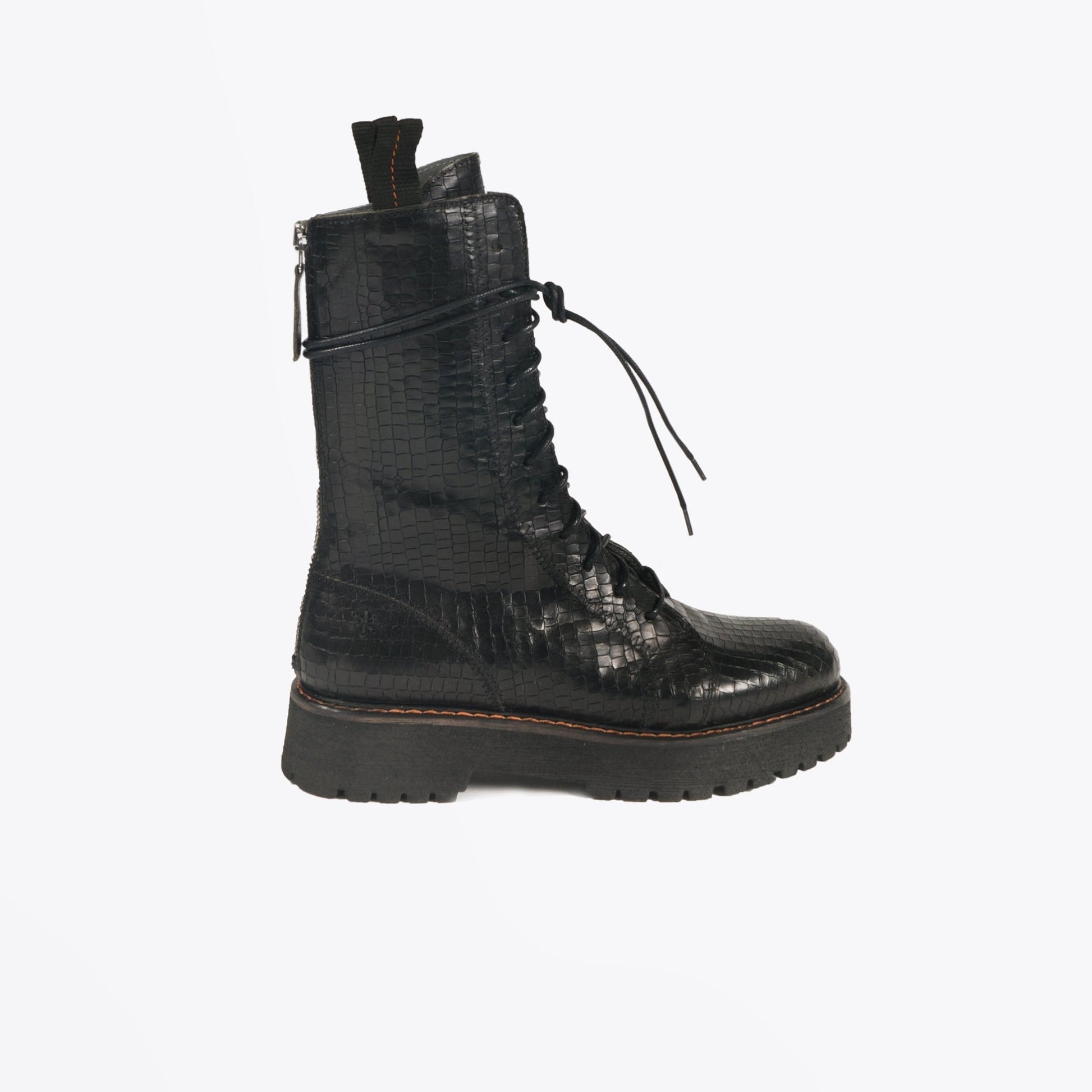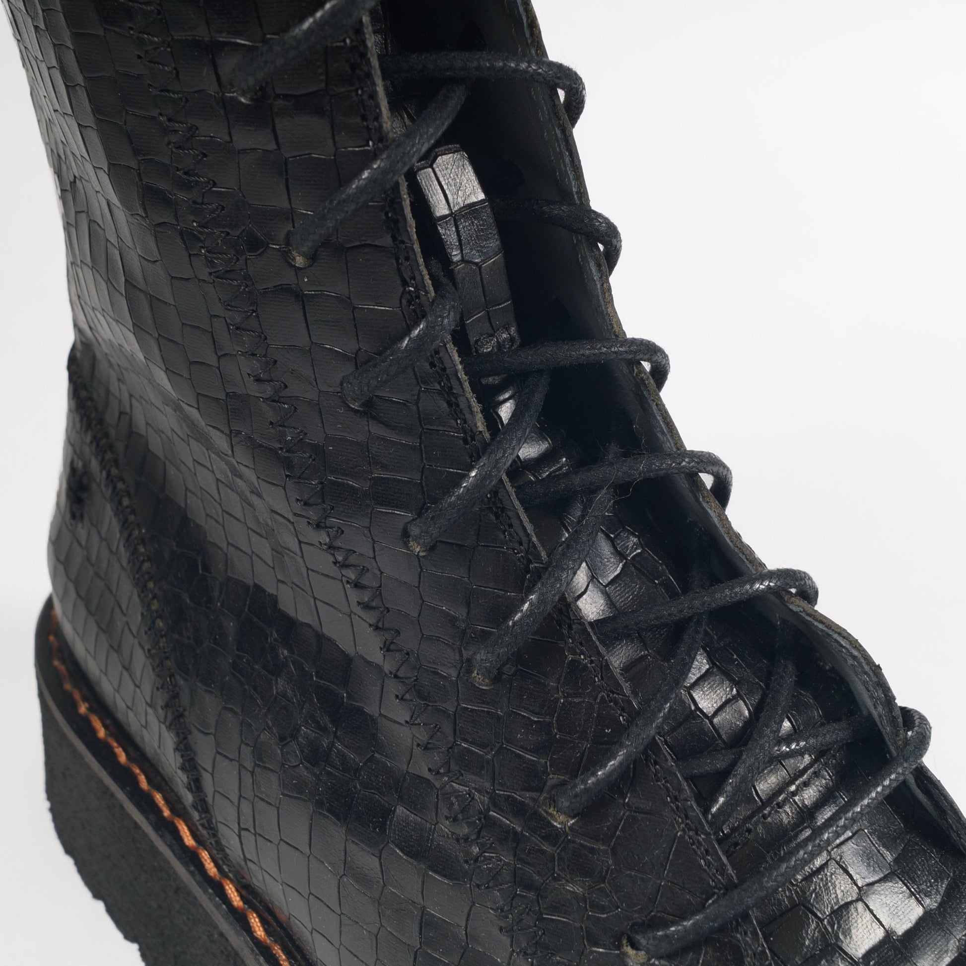 Innovative Italian footwear label Patrizia Bonfanti focuses on blending high quality, specially treated leather with unusual materials and textures to create its signature chunky boots and shoes. Crafted in textured black leather these chunky combat-inspired boots are the perfect stylish boot for all seasons. Laced in fine and soft black leather high above the ankle, these boots are bold but at the same time super chic thanks to the simple and clean line. Wear these stylish boots with a long and wide skirt or a mini dress. These are versatile for every look.