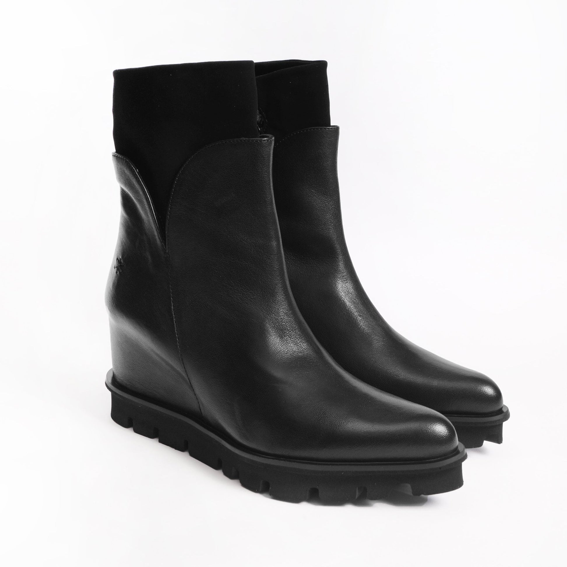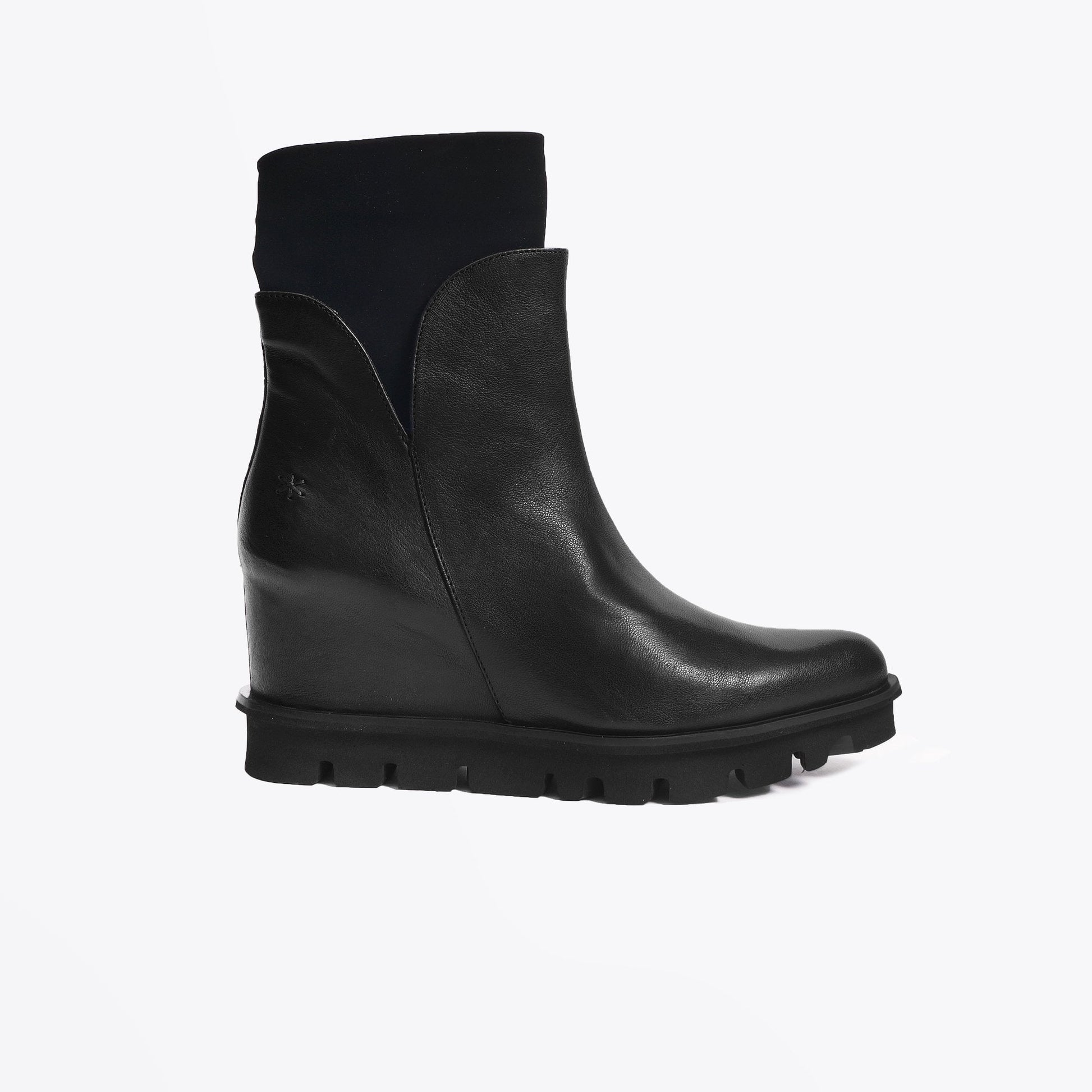 Innovative Italian footwear label Patrizia Bonfanti focuses on blending high quality, specially treated leather with unusual materials and textures to create its signature chunky boots and shoes. Crafted in smooth black leather these ankle boots with elastic fabric band are the perfect stylish boot for all seasons. Featuring an internal wedged heel, pointed toe and serrated rubber sole these boots are bold but at the same time super chic thanks to the simple and clean line. Wear Patrizia Bonfanti ankle boots with a stylish midi skirt which ends above the ankle for the nighttime or boyfriend trousers in the daytime.