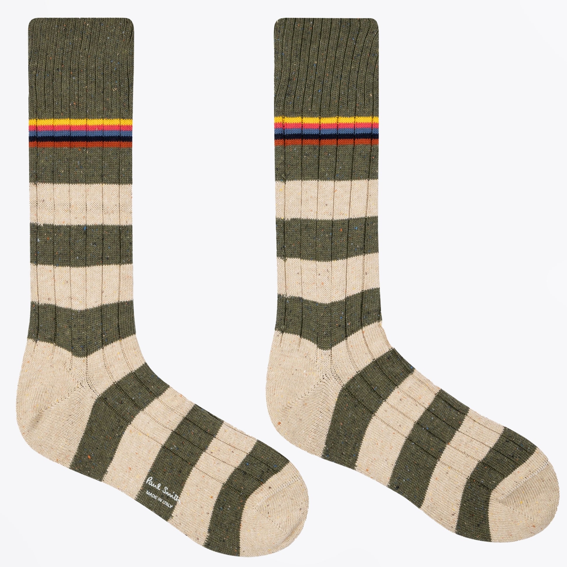 Paul Smith is a distinguished British designer who is renowned for his creative aesthetic, which combines tradition and modernity. Add a touch of designer luxury to your daily wardrobe, with some designer socks. This 3 pack socks features a multi signature Paul Smith stripe. This sock pack gives you three different colours, grey, navy and green in a striped design. These socks contain the Paul Smith logo printed on the sole, with a ribbed design on the hem. Wear these socks with a pair of leather shoes to add some fun to your suit attire.