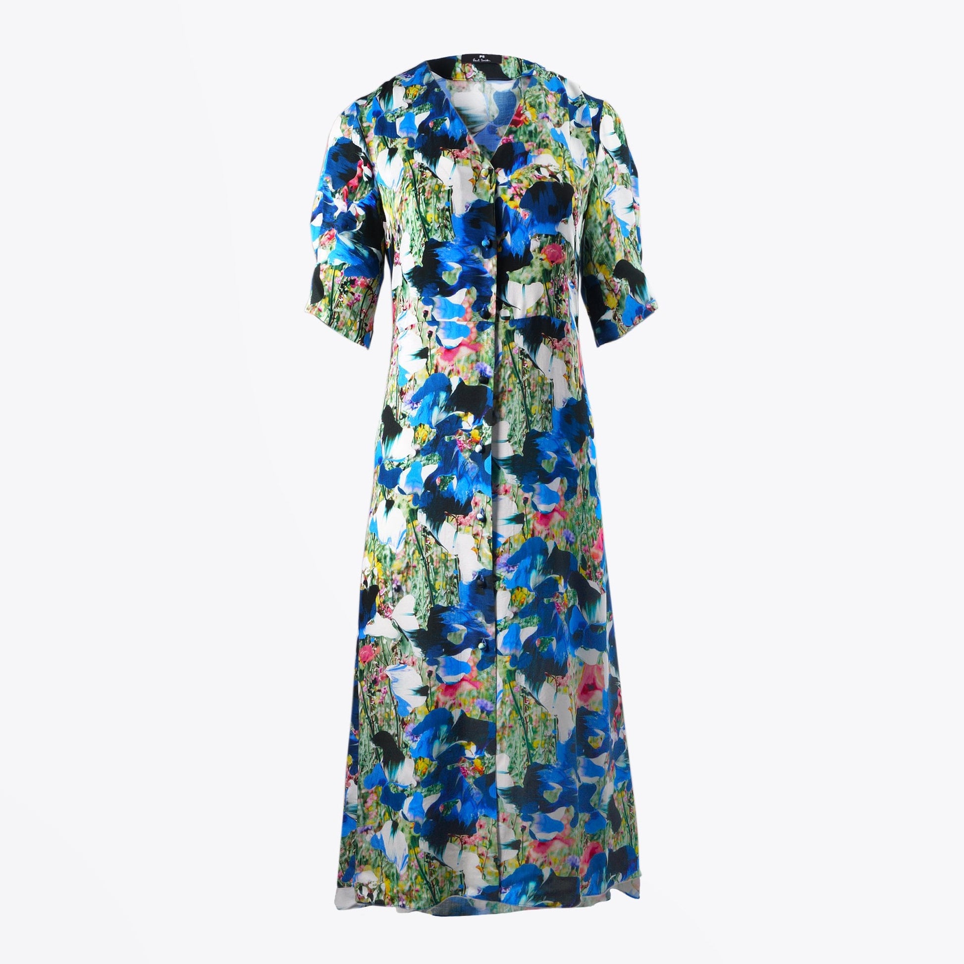 Paul Smith is a distinguished British designer who is renowned for his creative aesthetic, which combines tradition and modernity. Classic with a hint of eclectic is the key element of the company. Constructed from a soft lightweight viscose fabric, this short-sleeve tea dress with all-over abstract floral print features a button-down front falling into a slight slit opening at the bottom. This midi dress is finished with a v-neckline and ruffle detailing on the sleeve. This vibrant dress has a very flattering feminine silhouette which would be versatile to dress up or down! Perfect for relaxed summer barbecues or dressed up with heels for a wedding!