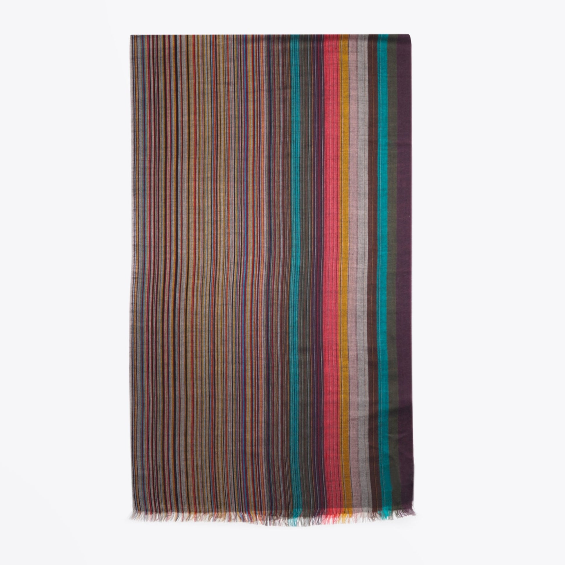 Paul Smith is a distinguished British designer who is renowned for his creative aesthetic, which combines tradition and modernity. Super soft scarf. This soft wool scarf features an 'Artist Stripe' with variation in sizing of stripe and is finished with tasselled ends and raw edges. Accessorise your look with this stylish and cosy scarf.