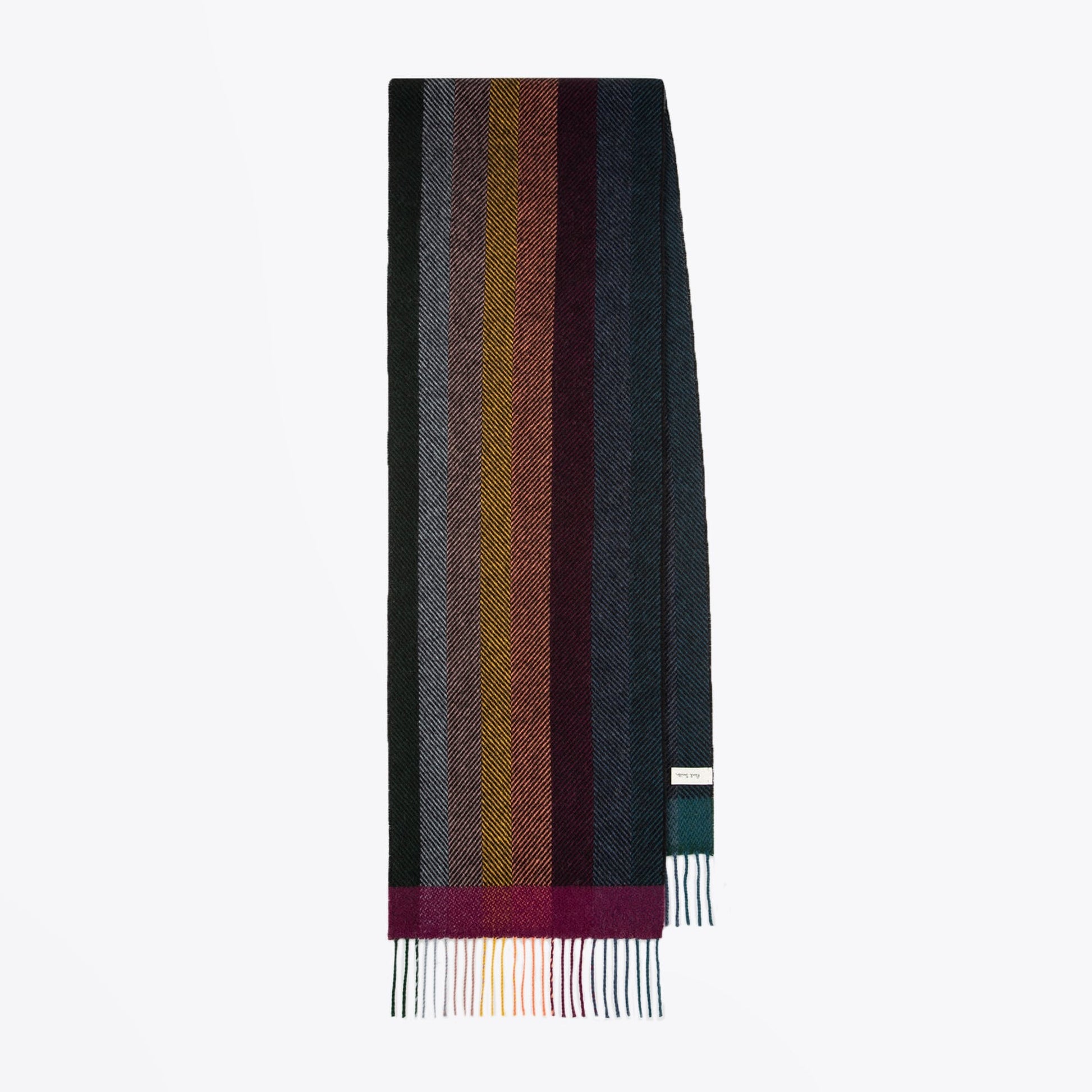 Paul Smith is a distinguished British designer who is renowned for his creative aesthetic, which combines tradition and modernity. Super soft scarf. Made from a premium wool and cashmere-blend, this scarf features a 'Artist Stripe' herringbone pattern throughout. Finished with raw edges and tasselled ends. Accessorise your look with this stylish and cosy scarf.