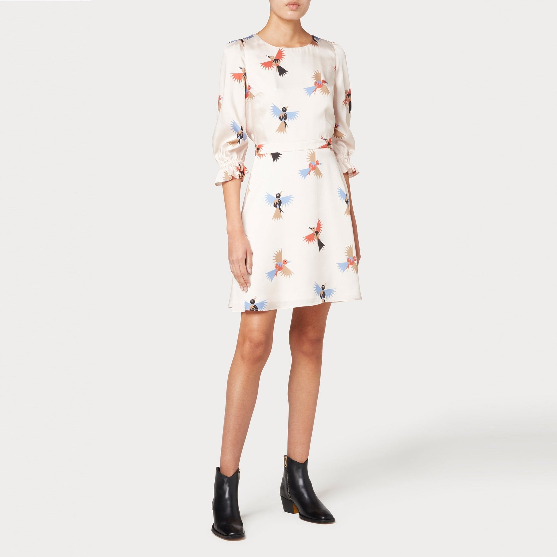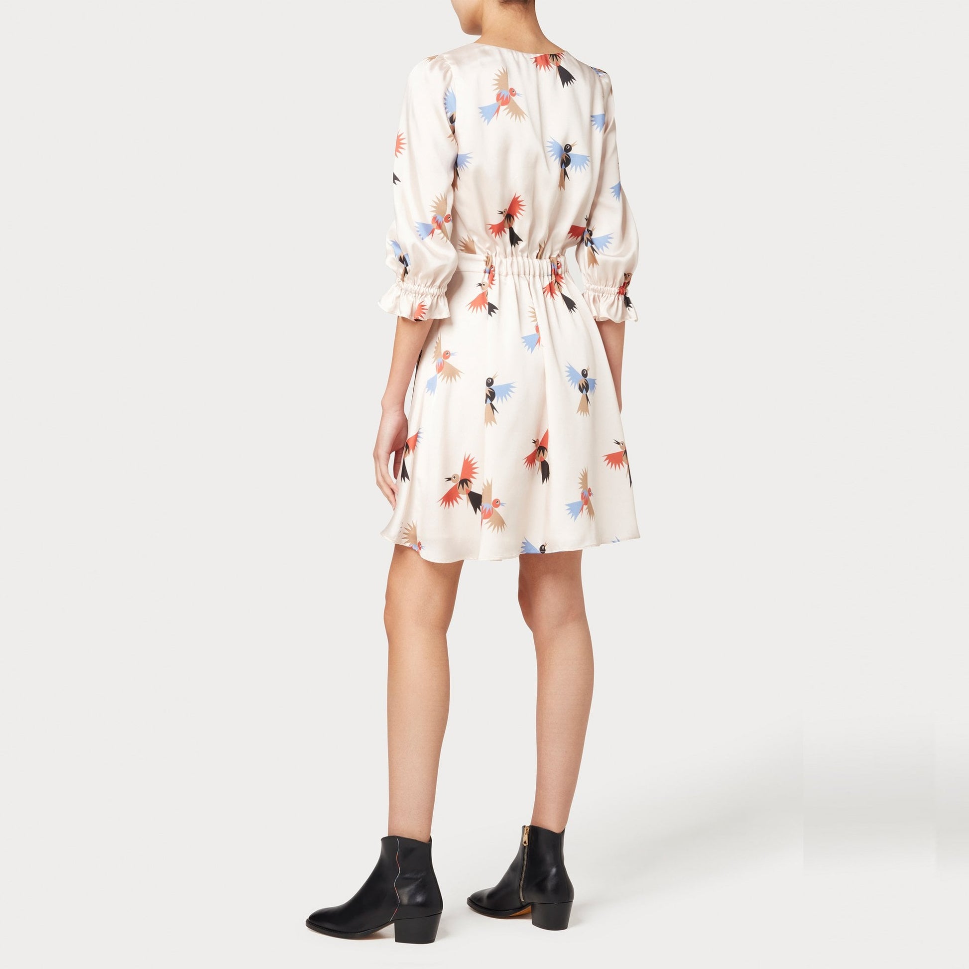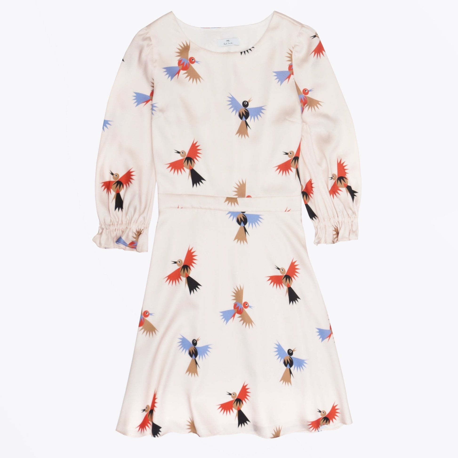 Paul Smith is a distinguished British designer who is renowned for his creative aesthetic, which combines tradition and modernity. Classic with a hint of eclectic is the key element of the company. This dress is a great way to add a neutral, whimsical print into your new season wardrobe. Crafted from a luminescent satin material, this natural light pink dress features a colourful bird print, in a mini dress length. The perfect blend between sophistication and fun, wear this dress with a pair of trainers in a muted colour or a pair of heels for a great dinner date outfit.