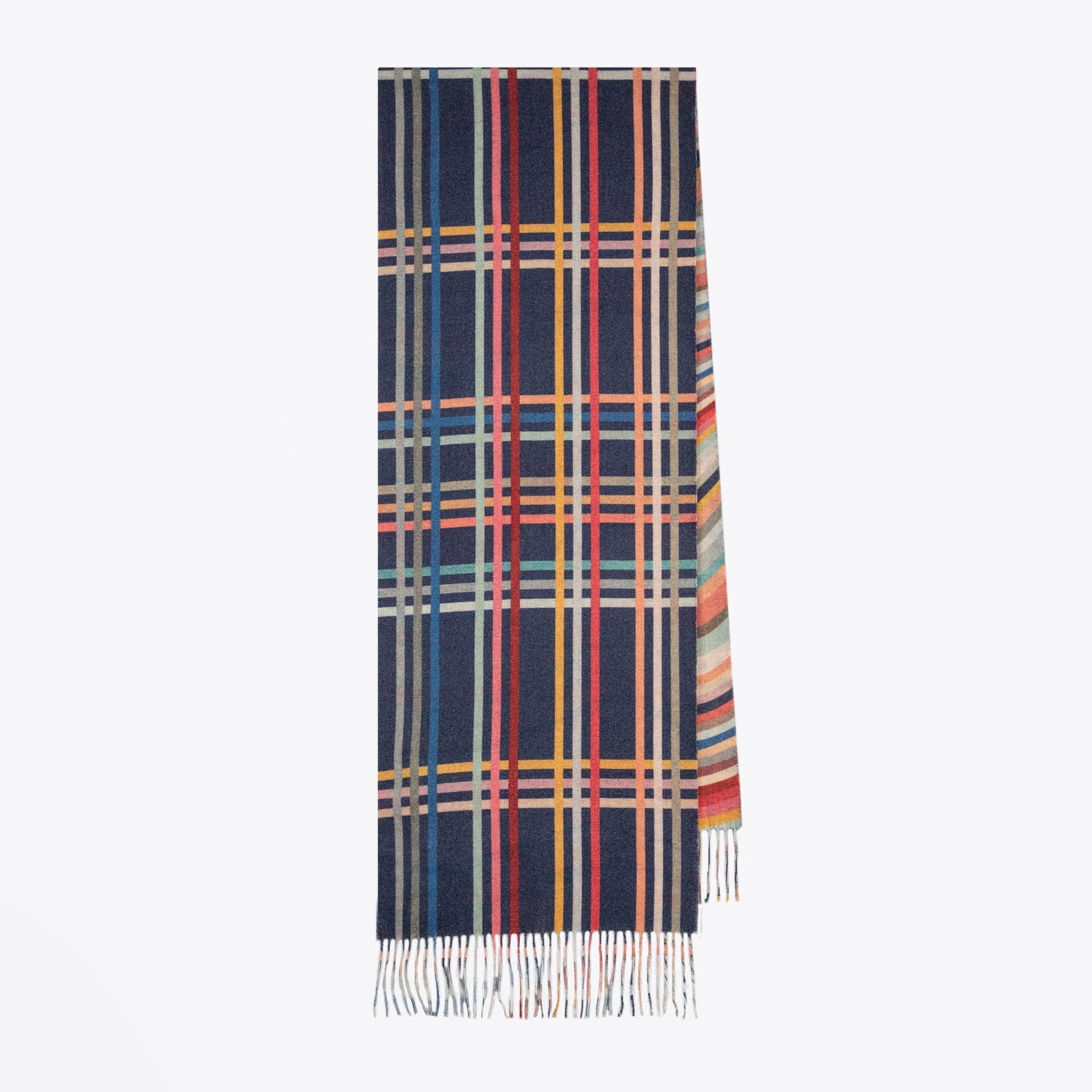 Paul Smith is a distinguished British designer who is renowned for his creative aesthetic, which combines tradition and modernity. Classic with a hint of eclectic is the key element of the company. Crafted in a luxurious cashmere and wool-blend fabric this double-sided scarf has been finished with a vibrant 'Swirl' print on one side and check print on the other and tassled edges with raw edges.