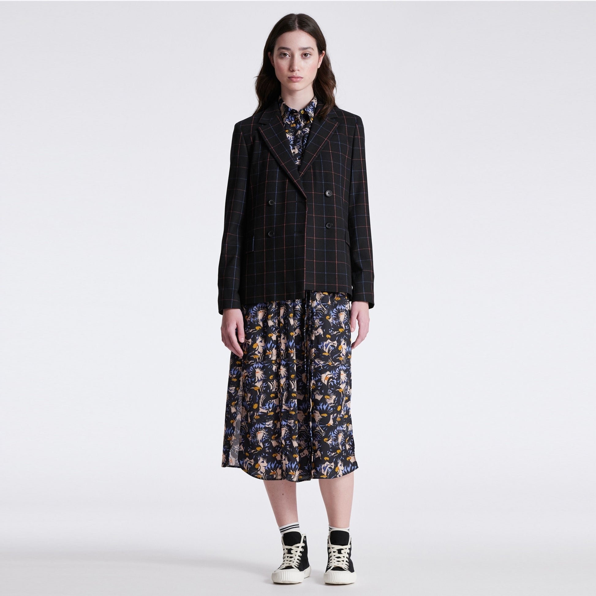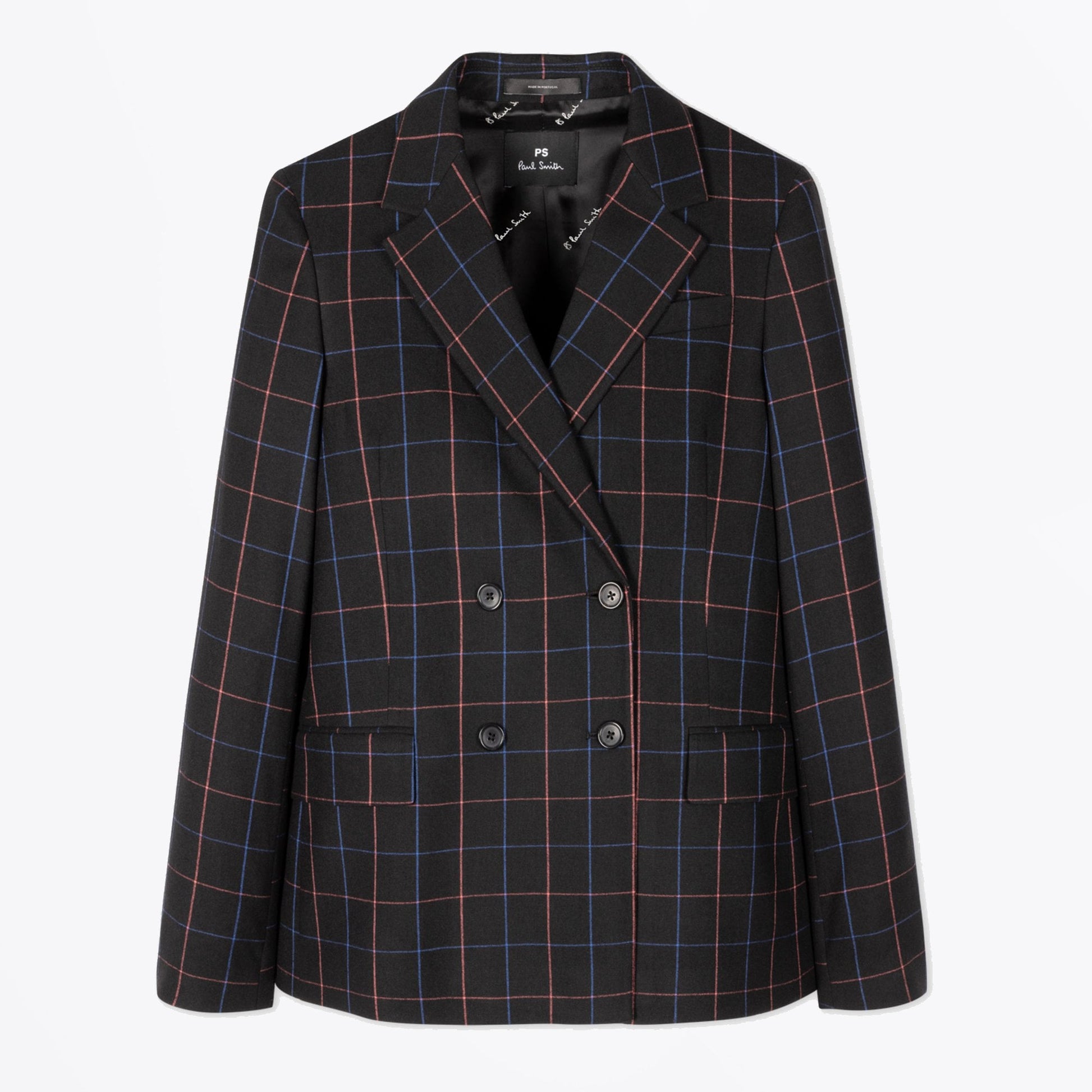 Paul Smith is a distinguished British designer who is renowned for his creative aesthetic, which combines tradition and modernity. Made in Portugal from a premium wool-blend, this black flannel blazer has a subtle pink and blue windowpane check pattern all-over. Complete with a full cupro lining, this double-breasted blazer is finished with flap pockets and a Melton wool under-collar.