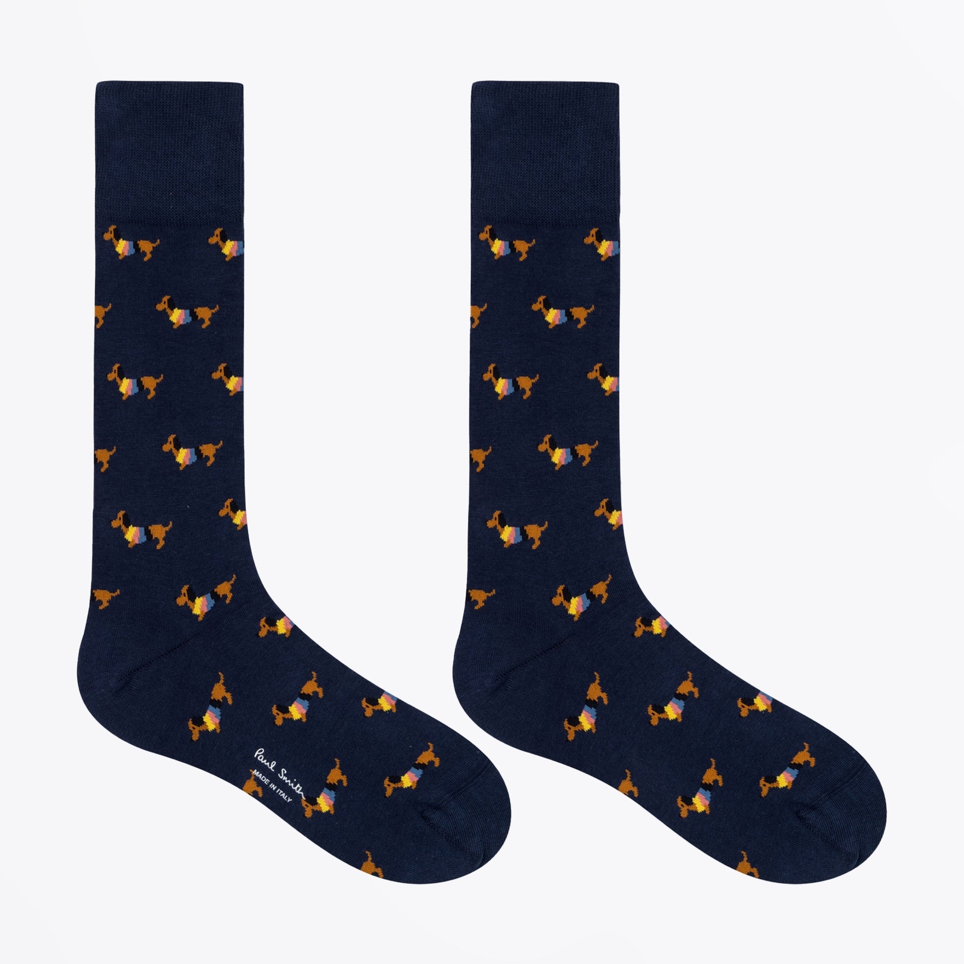 Paul Smith is a distinguished British designer who is renowned for his creative aesthetic, which combines tradition and modernity. Update your wardrobe staples with this option from Paul Smith.  These navy socks feature a “dog in jumper” pattern scattered throughout the sock, finished with ribbed ankles. Wear these socks with your suit attire for a fun twist to your work attire.