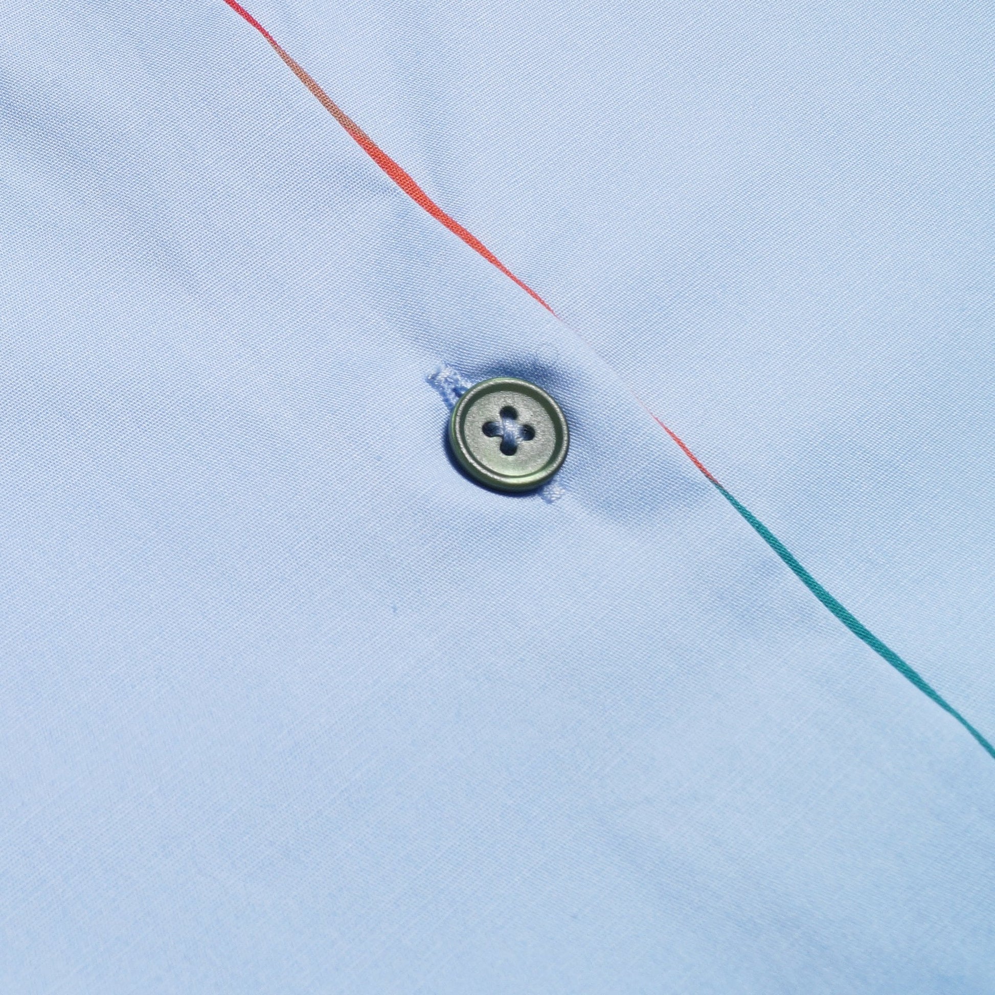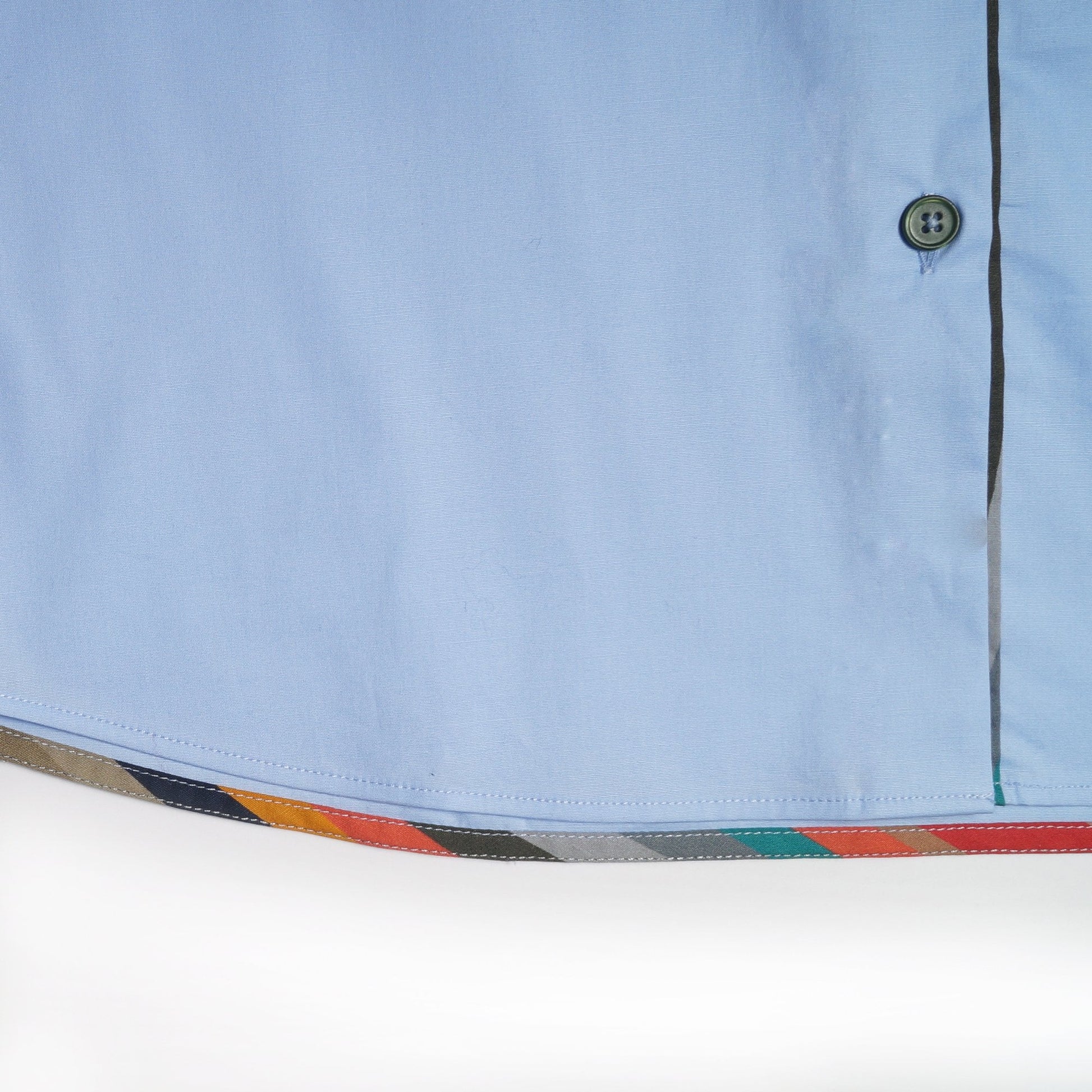Paul Smith is a distinguished British designer who is renowned for his creative aesthetic, which combines tradition and modernity. Classic with a hint of eclectic is the key element of the company. Constructed from cotton stretch blend, this classic blue long-sleeve shirt with multi-coloured stripe trimming on the hemline, cuffs and button placket with blue sheen buttons features a soft point collar, curved hemline, topstitching and single cuffs. Team this shirt with contrasting skirt or trousers for the perfect look for a special occasion or event!