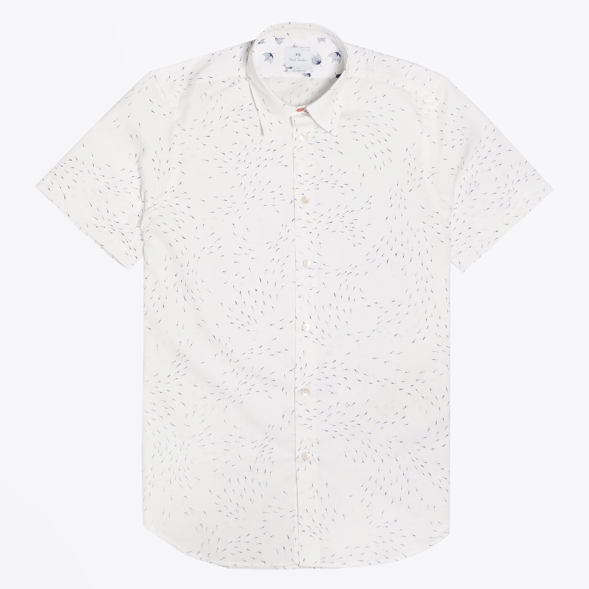 Paul Smith is a distinguished British designer who is renowned for his creative aesthetic, which combines tradition and modernity. This short-sleeve tailored-fit shirt is crafted in a 100% cotton and cut for a boxy shape. This lightweight shirt comes complete with an arrow print throughout, pearlescent buttons with contrast top pink button, a soft point collar, button down front and slightly curved hem. Men’s casual shirts with a hint of quirk are a Paul Smith staple.